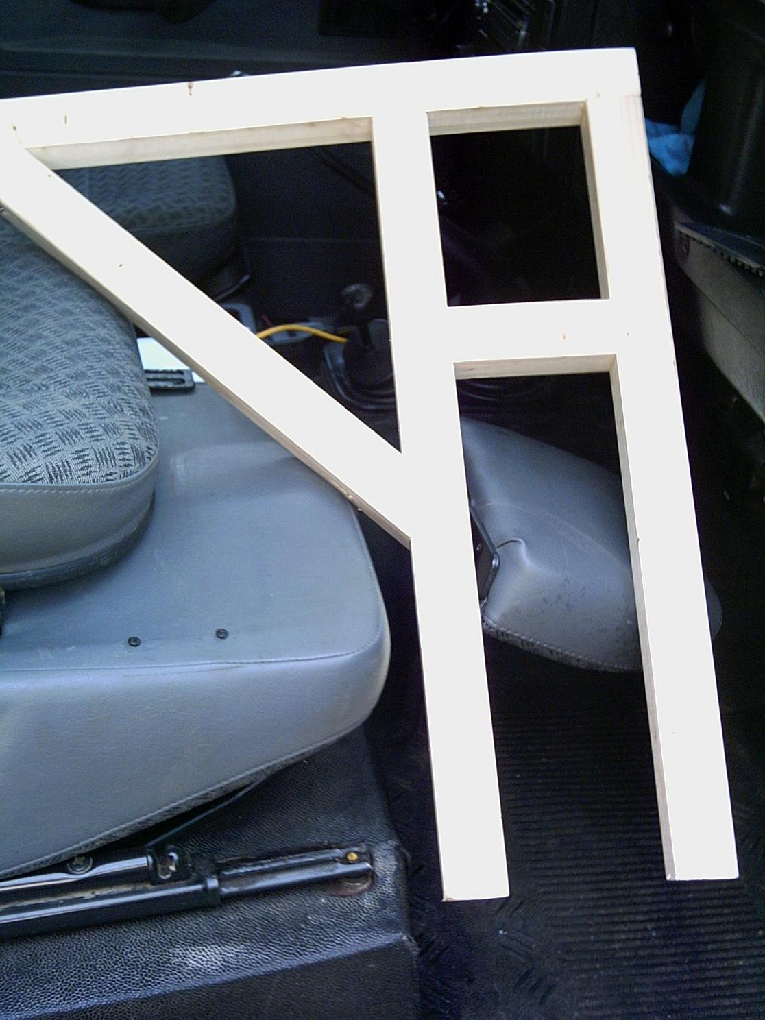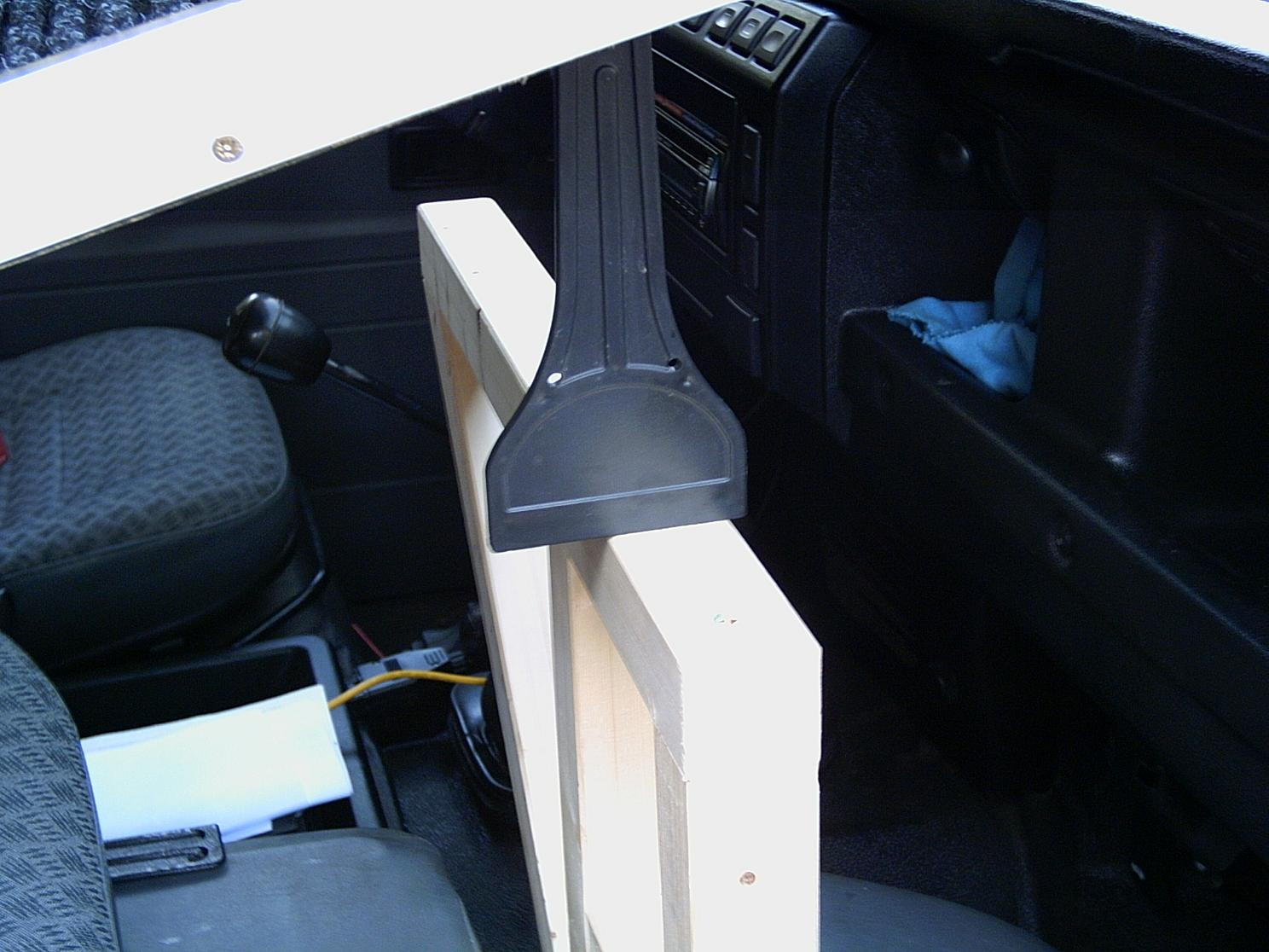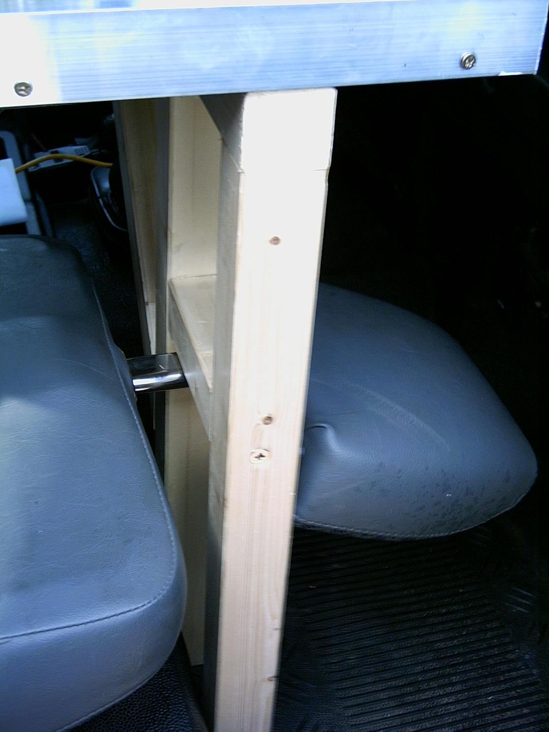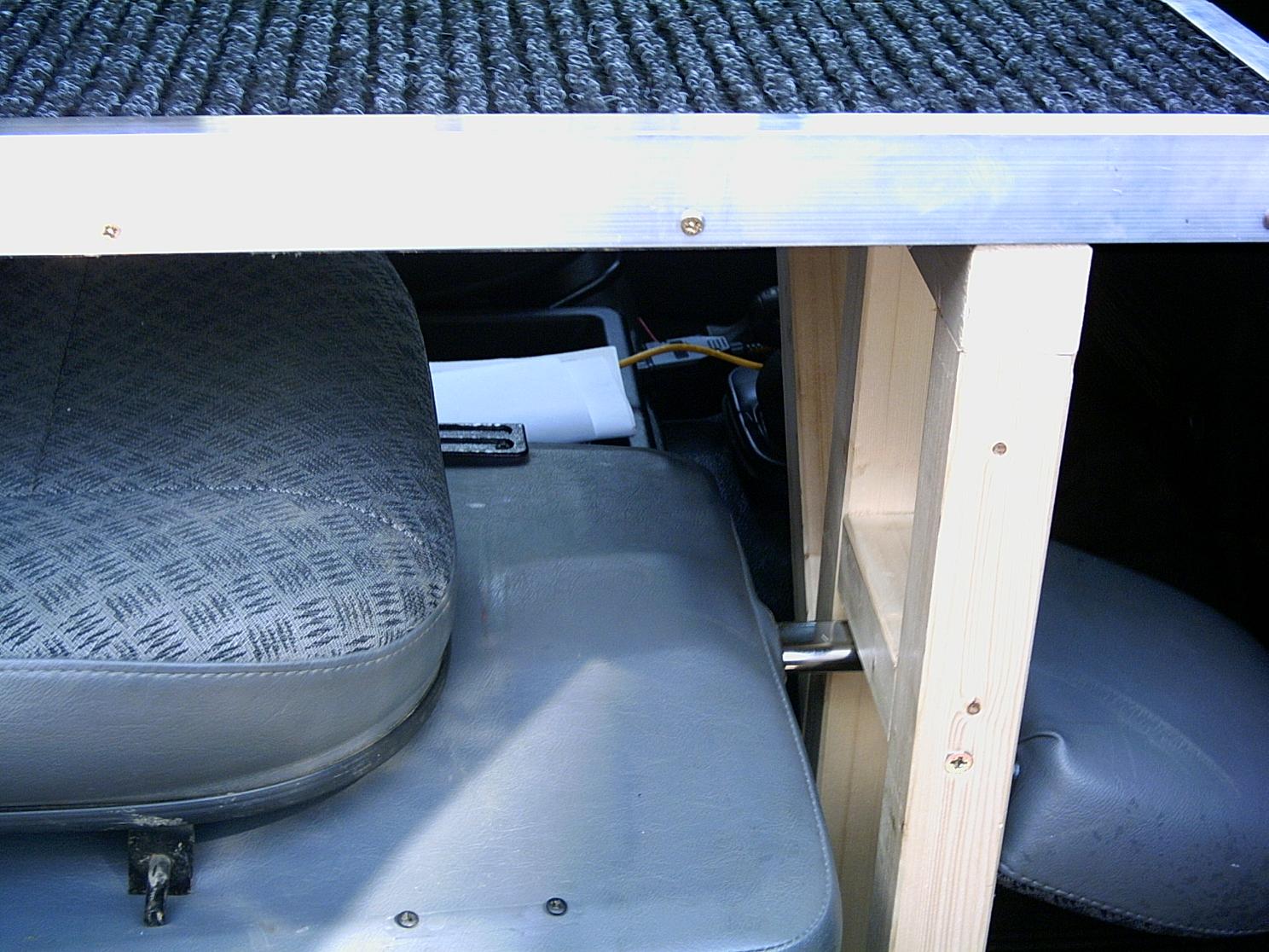 Le lit fini. Je rajoute un panneau dans le prolongement du caisson, fixé par des charnières de portes et soutenu côté tableau de bord par une structure en bois. Le dossier du siège passager doit être rabaissé