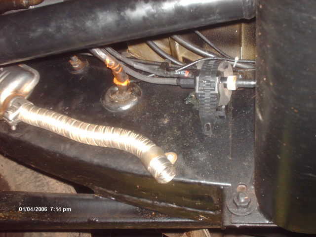 pose de la pompe je l'ai fixée sur le châssis avec un gros rylsan et entourée de mousse pour éviter la transmission du bruit. On en profite pour une vue de l'échappement, j'ai percé le châssis pour le fixer (attention à retenir le foret car le faisceau électrique passe dans le longeron) j'ai fait avec les bouts de tuyau que j'avais si la fumée remonte dans l'habitacle on verra plus tard. Reste à faire le le circuit d'eau, là je me pose des questions le sens de la circulation de l'eau serait (en touchant la durite la plus rapidement chaude) la durite sortant de la culasse (donc celle à couper pour ponter la chaudière?).