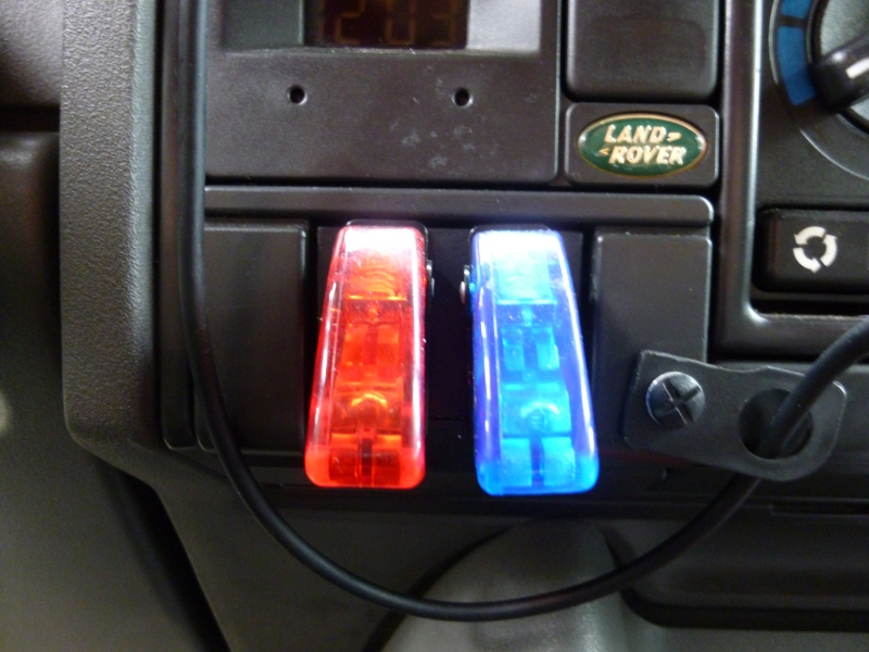 • + permanent pour la prise allume cigare du GPS et le transfo avec un interrupteur dédié pour celui-ci. L'ensemble peut être coupé par un interrupteur placé sur le tableau de bord (interrupteur "aviation" rouge sur la photo. (le bleu à côté c'est pour la pompe à eau qui est dans le coffre histoire que le robinet ne puisse pas s'enclencher sur une piste un peu trop "remuante").