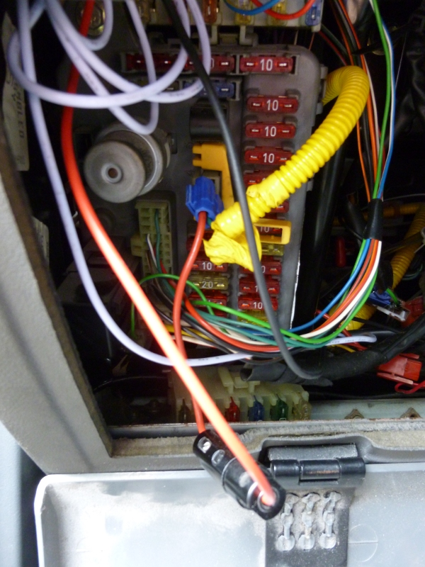 Le + après contact a été repiqué sur la boîte à fusible avec une simple cosse pirate (AMHA, on peut faire ça plus proprement...), j'ai rajouté un porte fusible pour y loger un 5A. Ce + alimente le voltmètre et les manos.