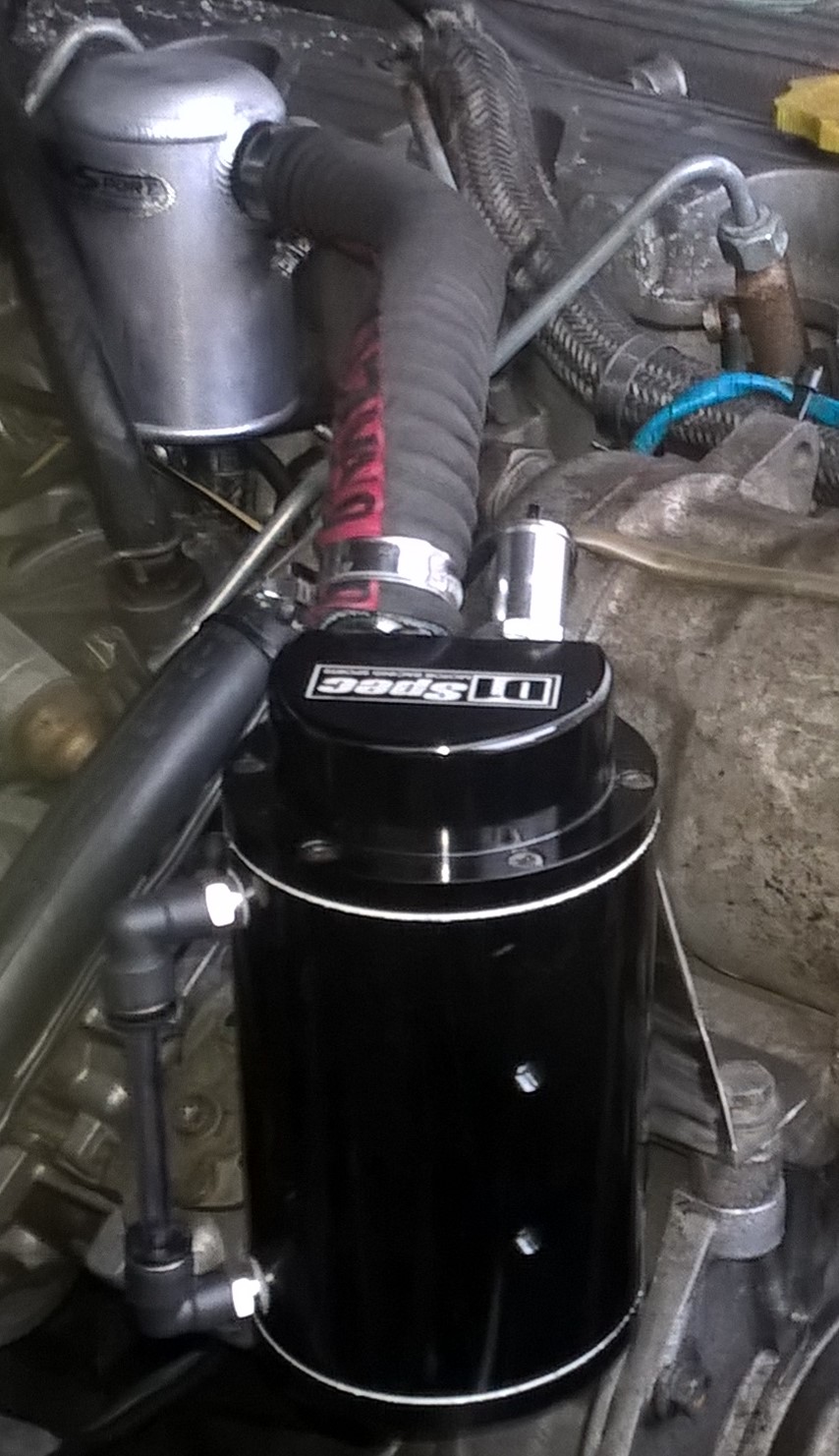 En fait on remplacé le boitier de filtre à air par des filtres K&N directement sur les carbus. Donc plus la possibilité de relier le reniflard d'huile à l'admission, d'où un récupérateur d'huile.... et puis cela faisait compétition (qui avaient le même problème