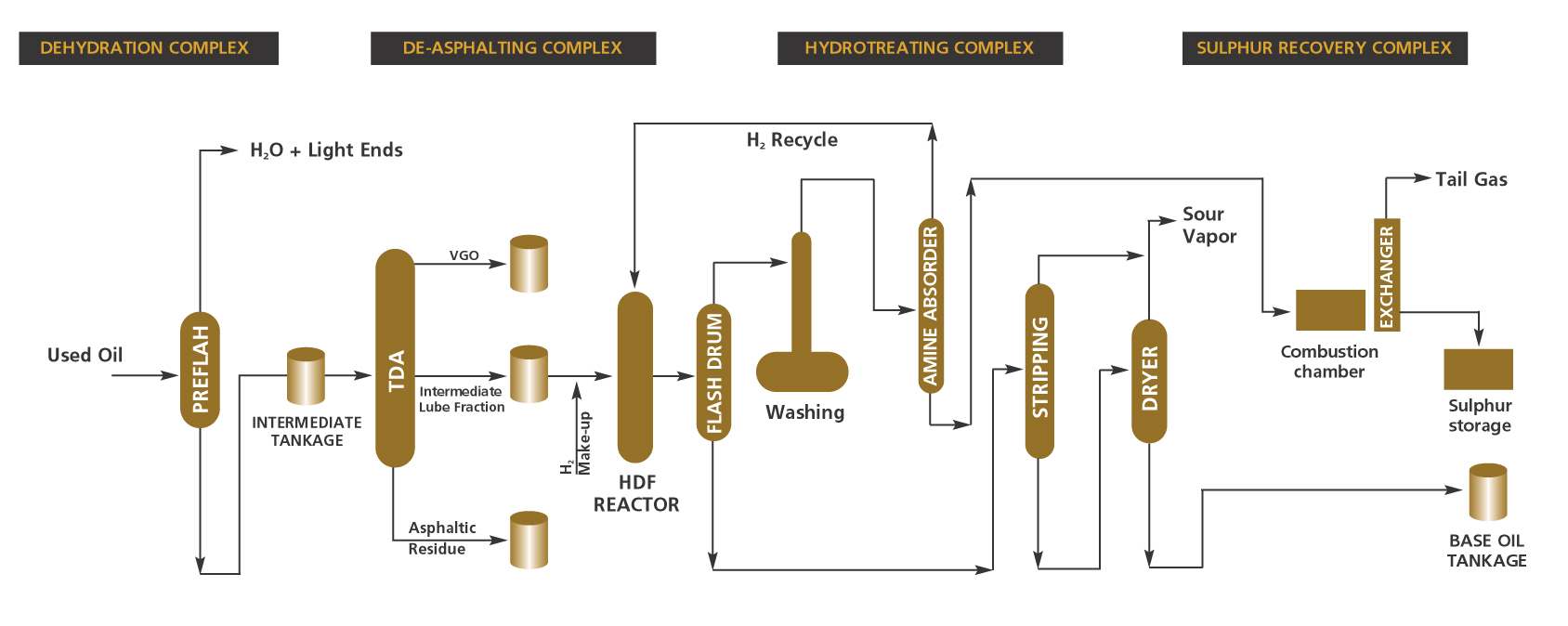 1) Preflash : l'huile usagée est chauffée à 140°C et est distillée dans une colonne à vide où l'eau est les composants légers sont séparés
