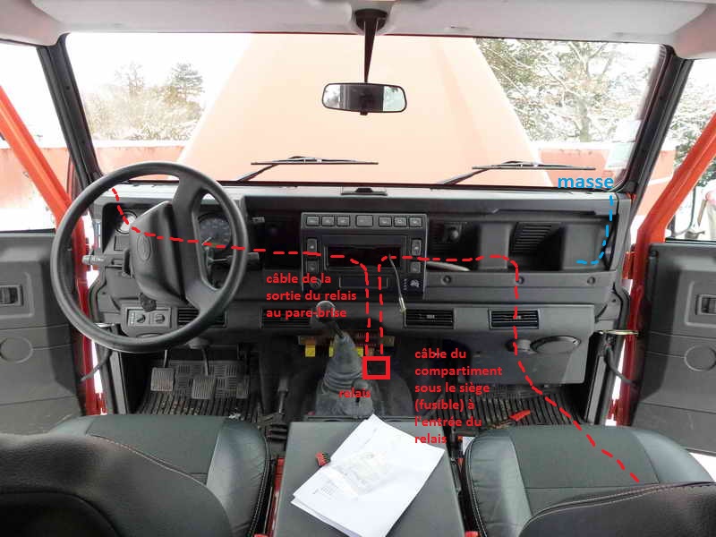 C'est là ou on s'amuse un peu à démonter le tableau de bord (ça n'est pas si compliqué), pour passer le gros fil de 6mm2 et l'amener à l'emplacement du relais de puissance (boite à fusible en avant du levier de vitesse).