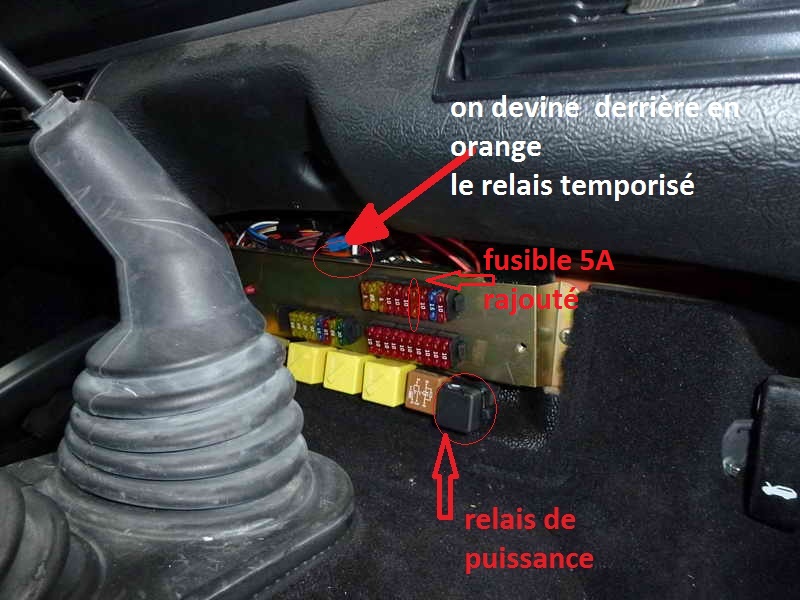 Pendant qu'on y est , on tire 1 fil supplémentaire (+12V, idem) pour alimenter le relais temporisé (GLR10) qu'on laisse vers la boite à fusible.
