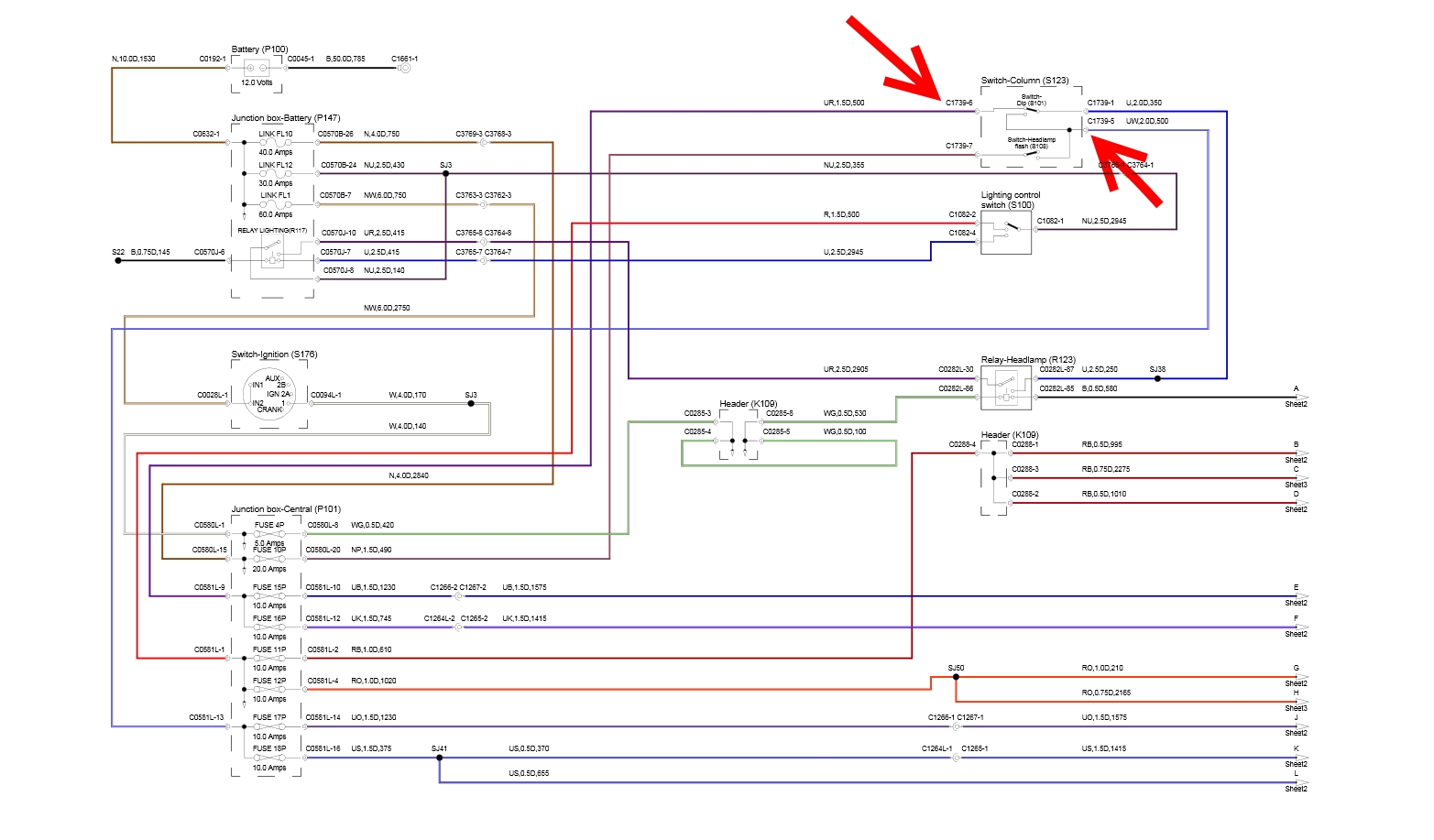 +12V va vers le grand commodo, et c'est lui que le relais R123 commute, et qui provient du petit commodo. Le grand commodo réparti ce 12V soit vers les code, soit vers les phares, donc jusque là tout va bien, c'est après que ce situ le problème.
