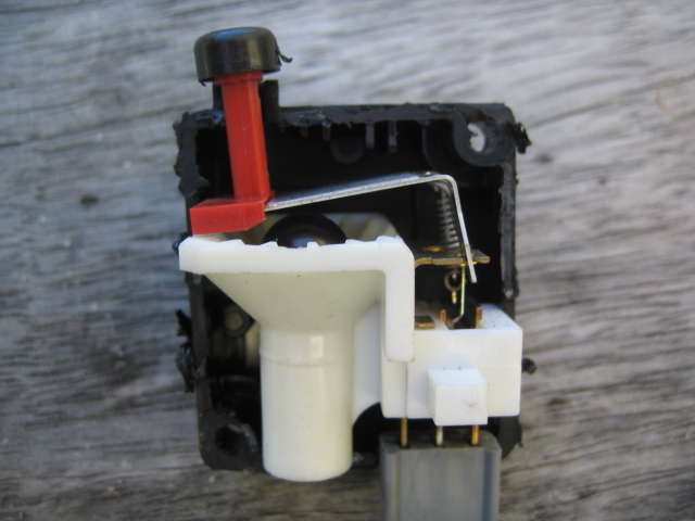 2) Bouton sortie, la partie rouge est visible. On peut distinguer une bille en acier au fond d'une petite cuvette en plastique blanc. C'est elle qui fait cloc-cloc lorsqu'on secoue le bouton, c'est elle aussi qui enclenche la palette en position haute en cas de choc. Elle est maintenue au fond de l'entonnoir par un petit aimant.