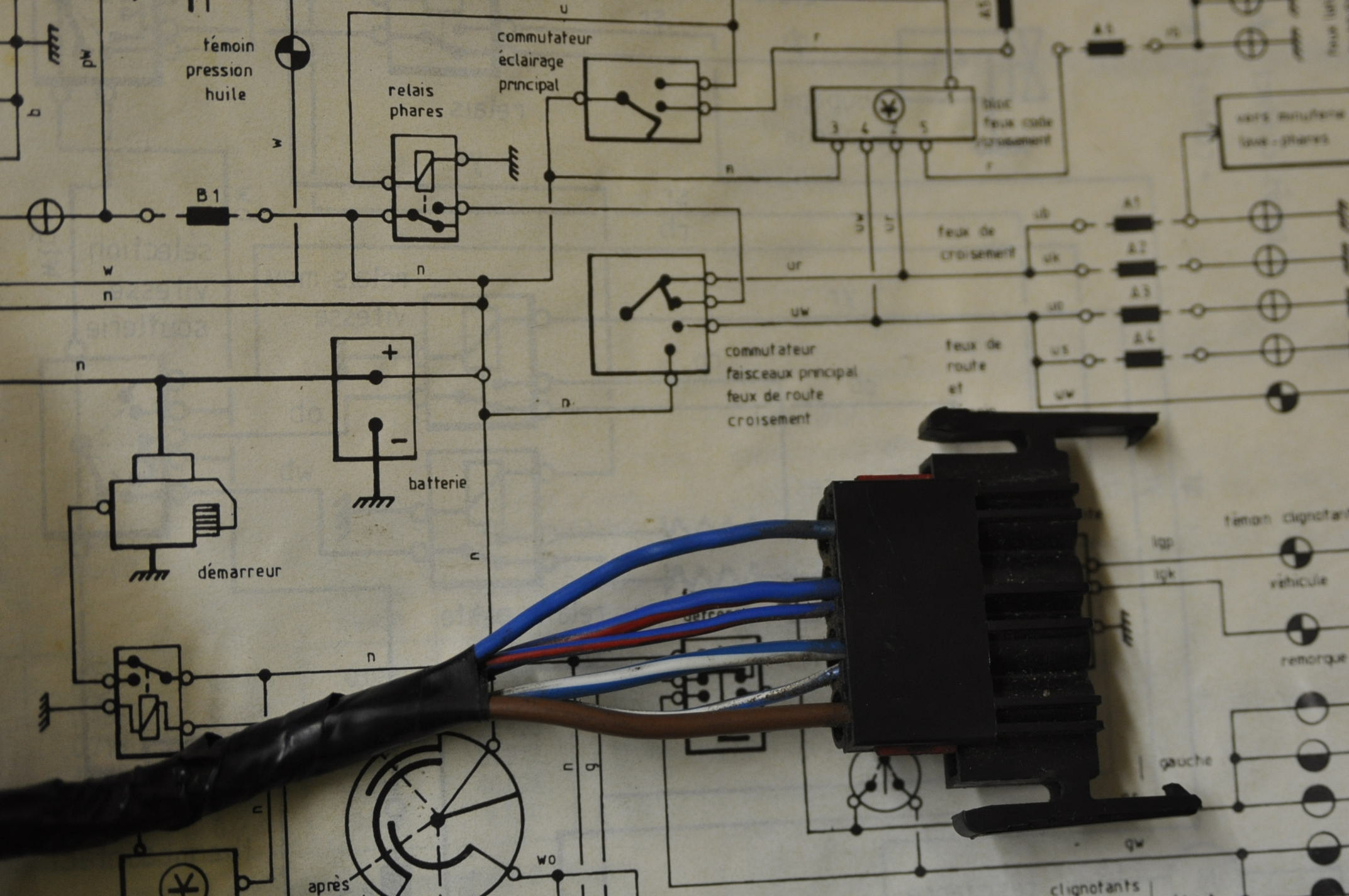1) Un schéma, pas vraiment terrible. 2) Connecteur du faisceaux principal feux de route croisement. Cela permet de retrouver les couleurs des fils non marquées sur le schéma: ur= bleu liseré rouge, pour les feux de croisement.