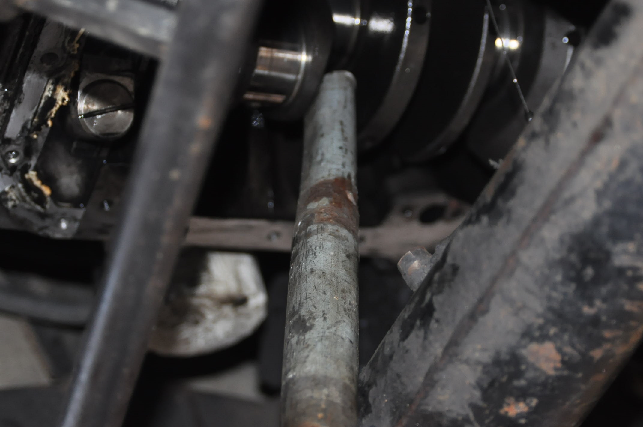 43) Avec un levier, on force en latéral sur le vilebrequin, en prenant appuis sur le pont, pour glisser la cale.
