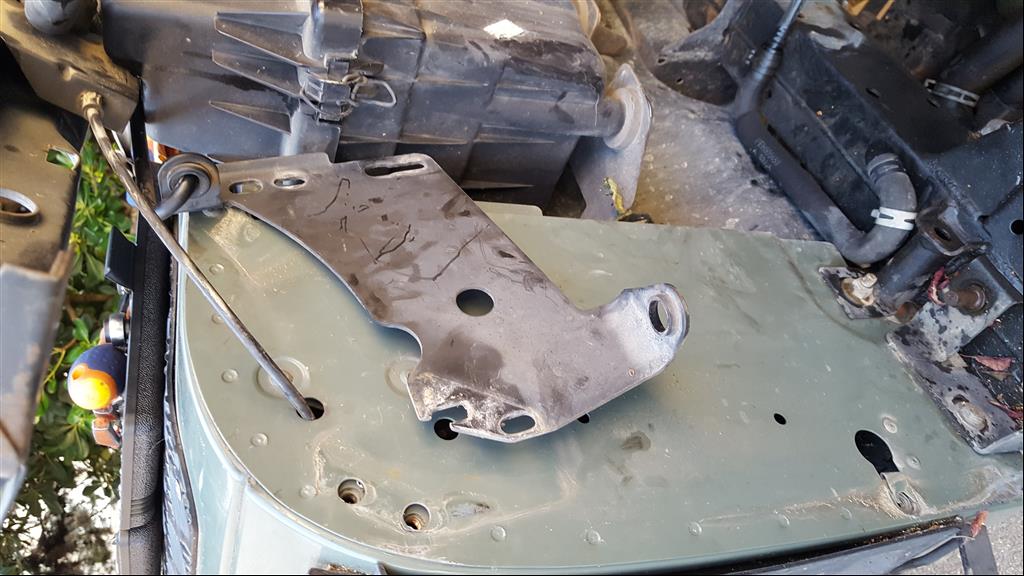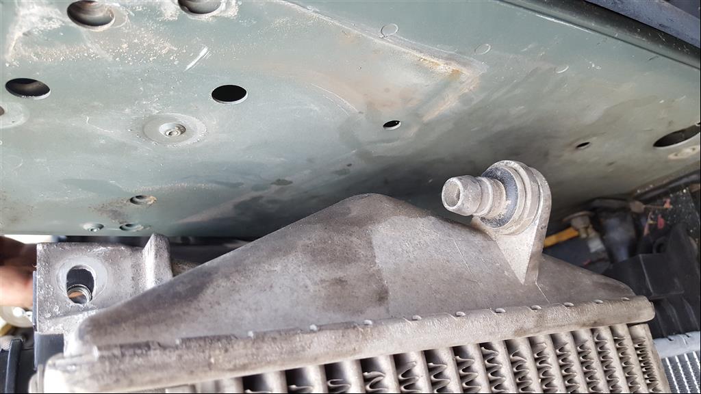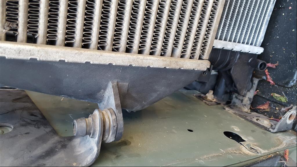 Il y a de solides tétons de chaque coté pour y emboiter le radiateur neuf (voir platine soudée près du repère vert et des feuilles mortes...) :