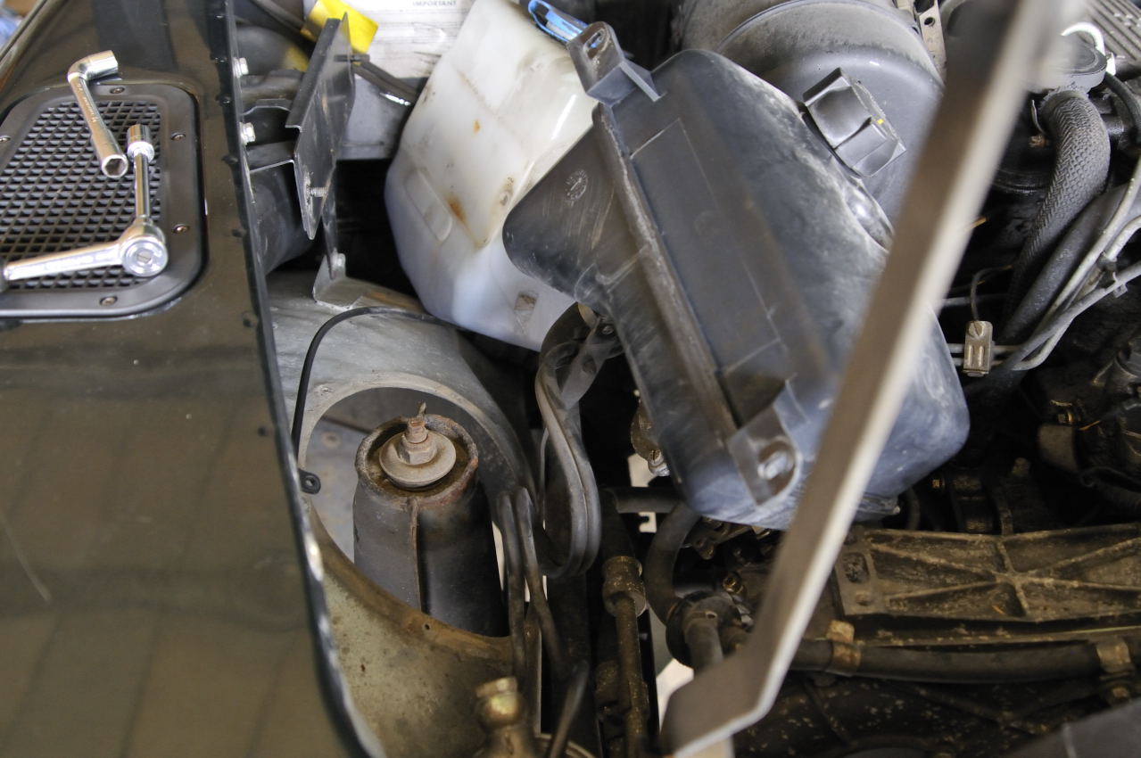 Le cache enlevé, on accède directement à la tourelle et à la fixation supérieur de l'amortisseur. Ne pas essayer de démonter la fixation supérieur de l'amortisseur car c'est une perte de temps, surtout si c'est une peu corrodé. Il vaut mieux enlever la tourelle avec l'amortisseur et défaire la fixation supérieur hors du véhicule.