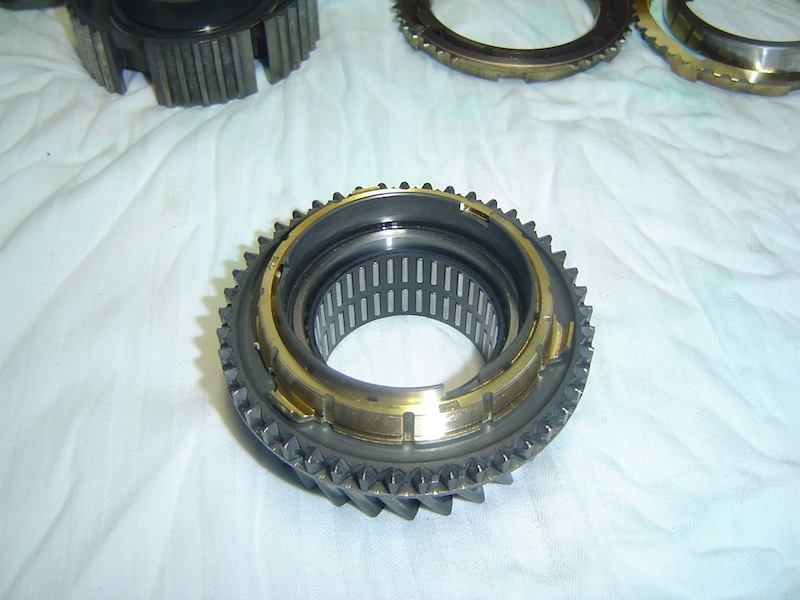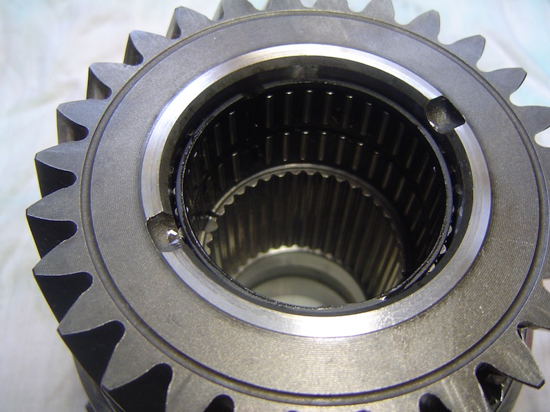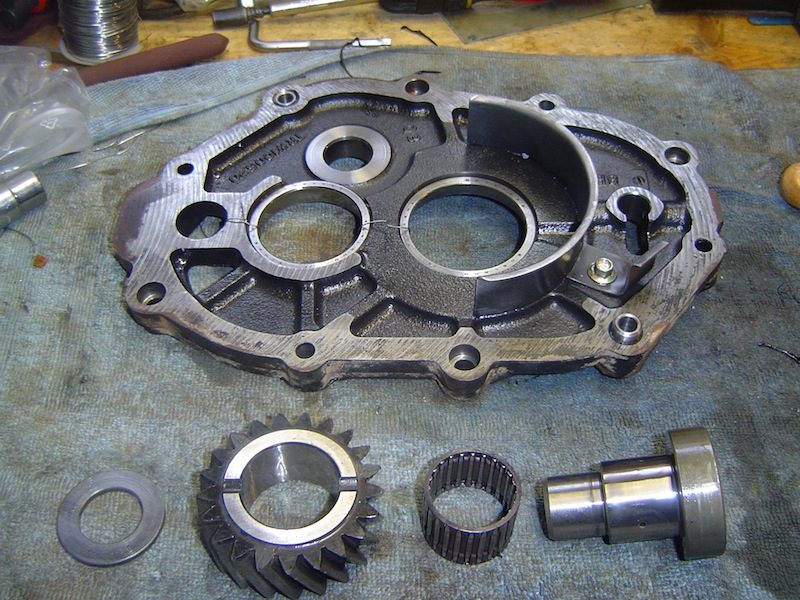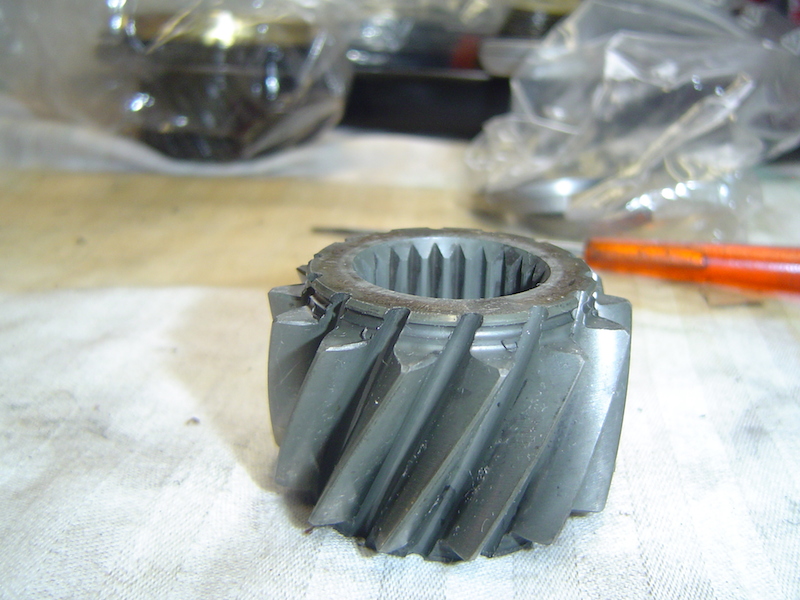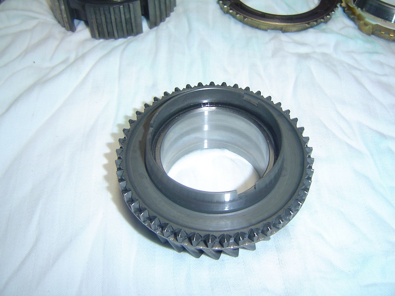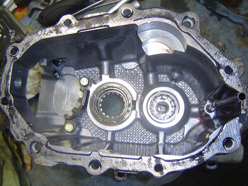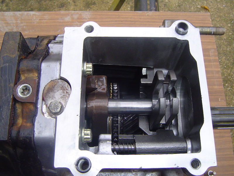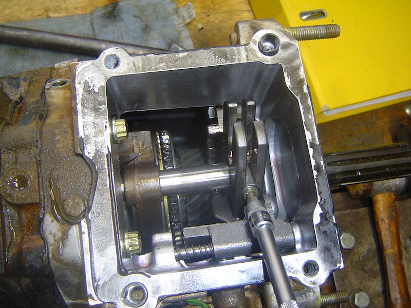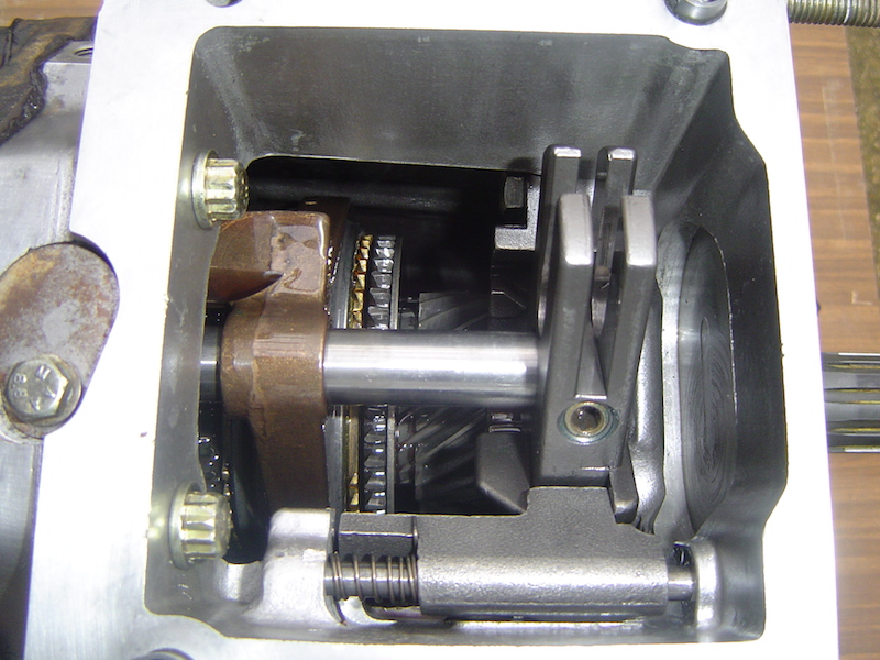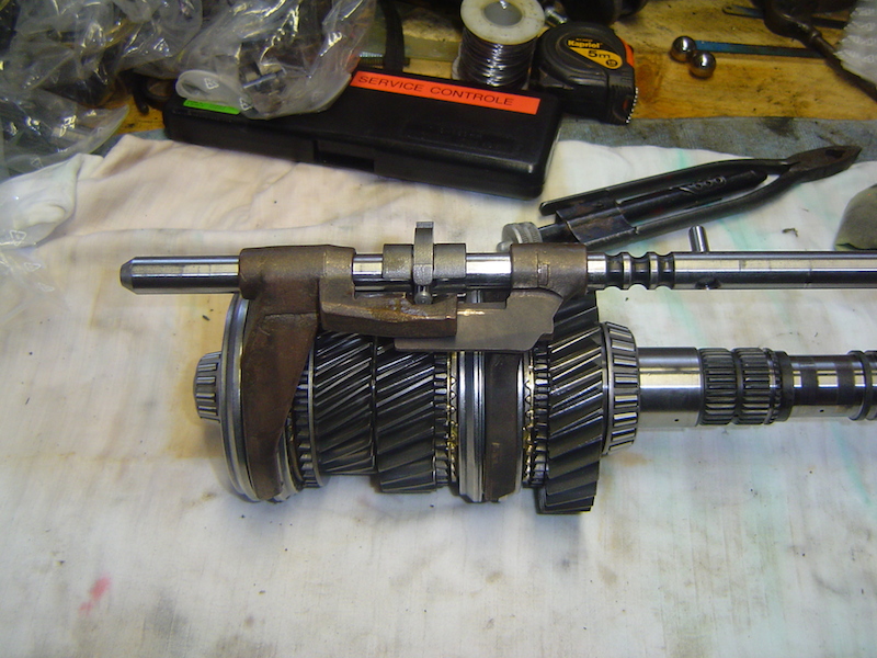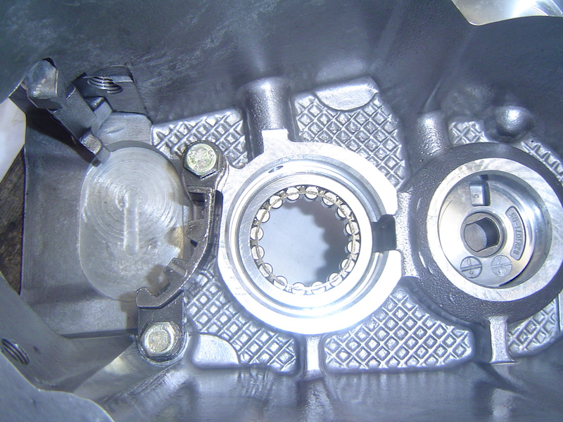 Côté boite, on découvre les pignons de 5° et de MA, la fourchette de commande et les synchros, et les bagues intérieures des roulements à rouleau.