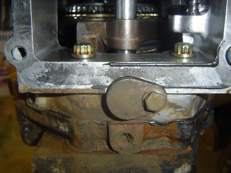 On dépose le carter en tirant vers le haut. Il faut peut être le décoller un peu à cause de la pâte joint. Prendre garde au tube de piquage d'huile. On découvre, au fond du carter, le roulement à rouleau de l'arbre de sortie, et le roulement à rouleau de l'arbre secondaire. Notez l'entrainement de la pompe à huile avec ses 2 méplats.