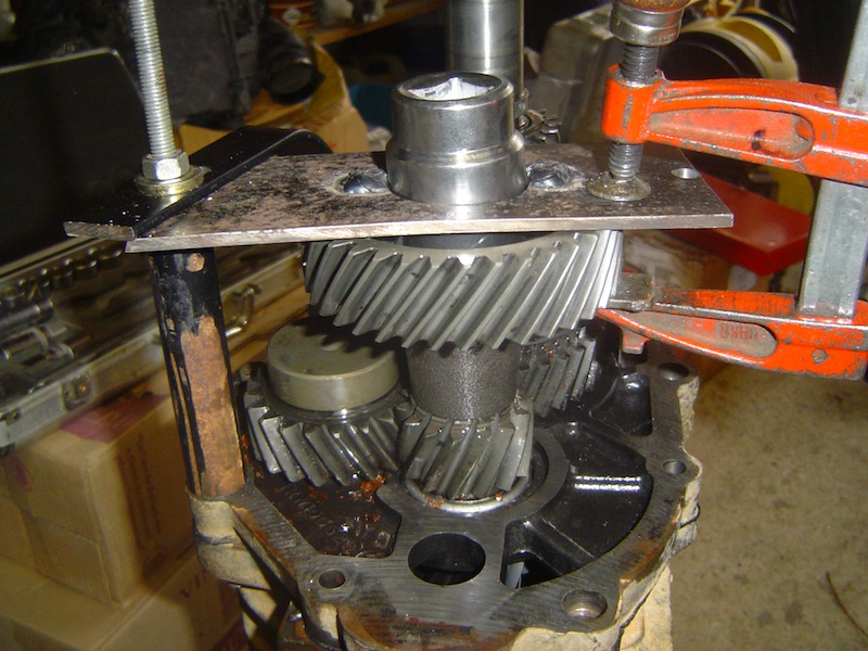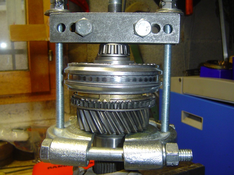 On commence par le roulement arrière de l'arbre de sortie. En prenant appui derrière le pignon de 1°, et en faisant pression sur l'arbre de sortie, on chasse le roulement. Notez que l'outillage utilisé n'est pas celui qui est prévu par le manuel.