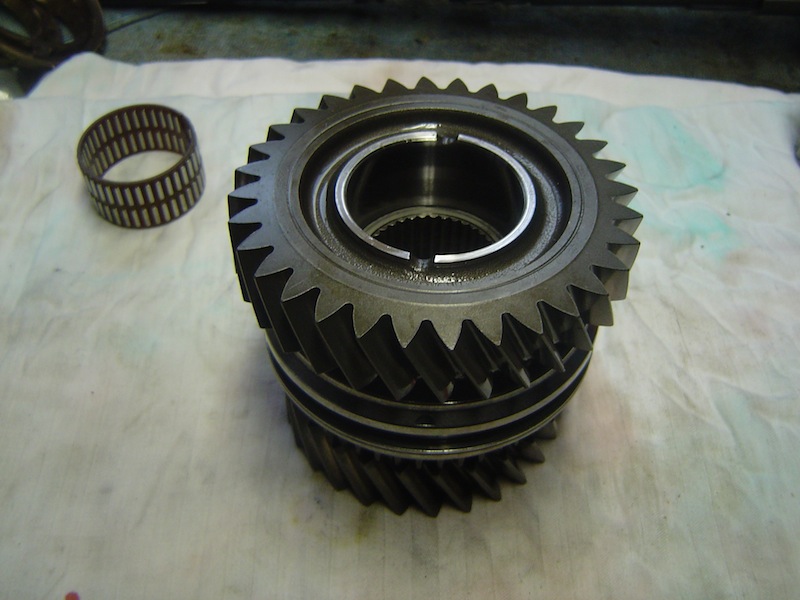 On se saisi maintenant de l'arbre de sortie. Après l'avoir nettoyé et vérifié, notamment les conduit de graissage. On enfile dessus notre ensemble pignon de 3° et synchro on met en place la rondelle d'appui.