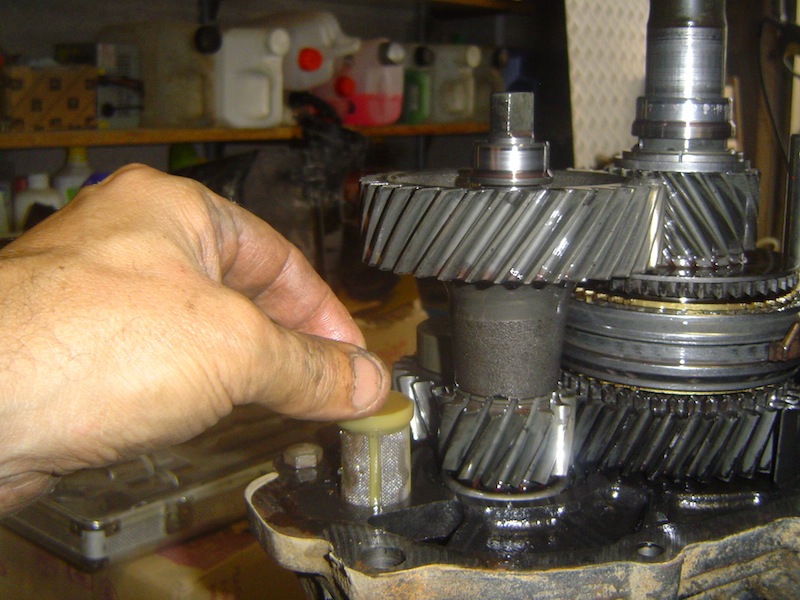 Sur la plaque intermédiaire, on chasse l'axe du pignon d'inversion de marche arrière. On récupère la rondelle, le pignon, la douille à aiguilles et l'axe.
