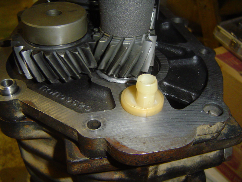 Juste en dessous, on trouve l'écrou de maintien du pignon de 5° de l'arbre secondaire. Notez les 2 creux dans le pignon ainsi que les méplats chargés d'entrainer la pompe à huile.