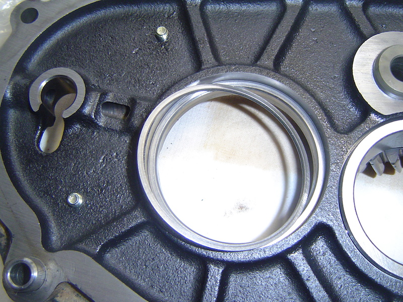 Derrière cette plaque, on trouve la bague extérieure du roulement de l'arbre d'entré et son joint spi, ainsi que la bague extérieure du roulement avant de l'arbre secondaire. Cette dernière possède une rainure extérieure avec un clip.