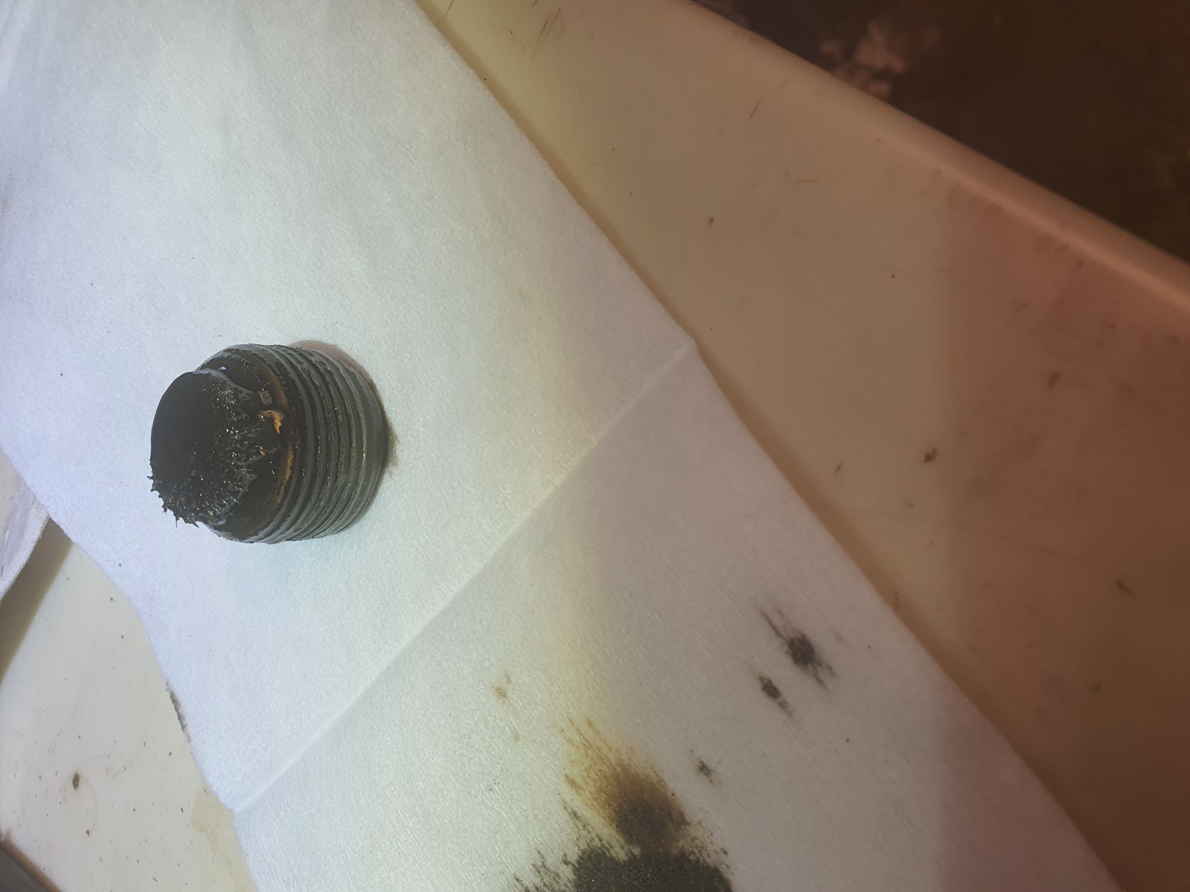 La boite de transfert: huile fluide (je dirais comme le pont arriere) couleur grise, bien chargée en particules, avec sur le bouchon aimenté de la limaille et un "copeau" d'aspect cuivré