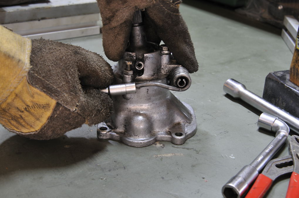 Dévisser les trois vis de fixation du couvercle de la pompe. Clef de 10. Il n'y a rien de plus à démonter pour la pompe. Ne pas essayer d'enlever le tube d'aspiration d'huile. Vérifier seulement qu'il n'est pas colmaté.