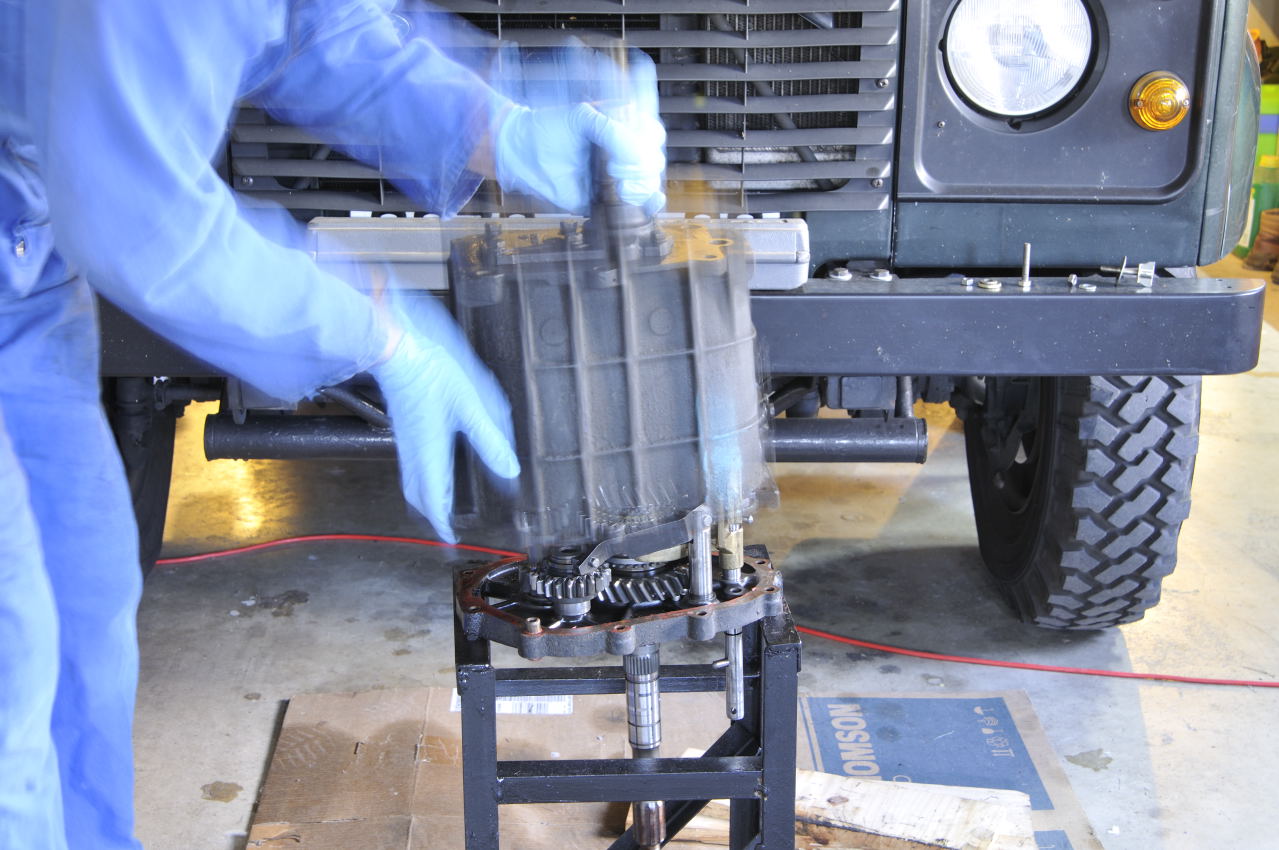 Sous le support du levier, on remarque que sur les Discos, le levier de vitesse commande directement l'axe de sélection de la BV. L'axe de sélection est donc différent et plus court que celui des LT77 des Defenders.