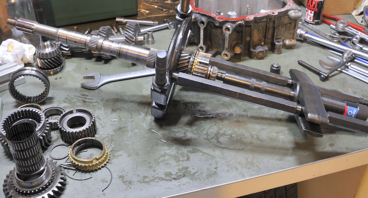 On remarque bien que le pignon d'entrainement de l'arbre intermédaire, le crabot de quatième (prise direct) et l'arbre primaire sont une seule en même pièce. J'enléverai la bague extérieure de roulement (qui guide l'arbre secondaire) planquée à l'intérieur de l'arbre plus tard. Je n'ai pas l'outillage adéquate pour l'instant, Land Rover préconise un extrateur à inertie.