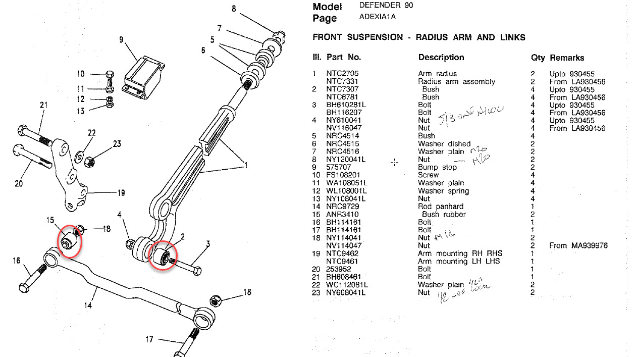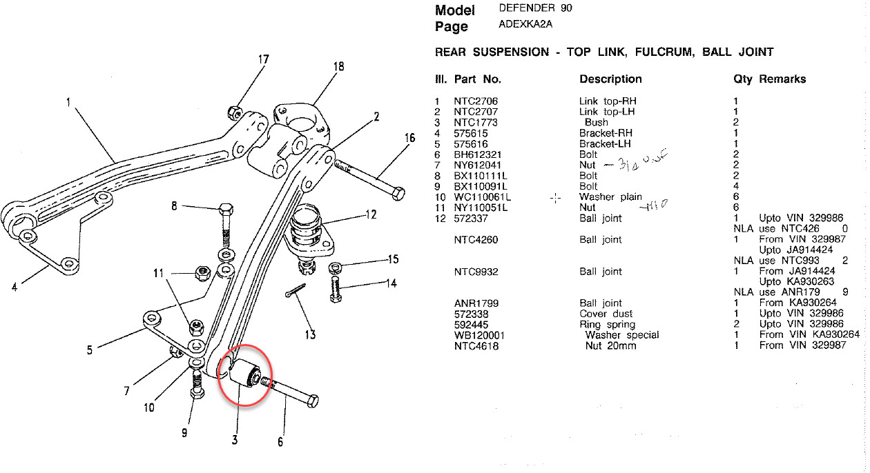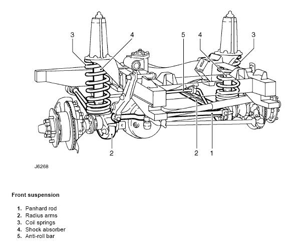 Link (suspension) : terme anglais pour bras ou biellette. "3 link" indique qu'il y a 3 bras (ou biellettes) qui guident le pont (cas pont rigide) où la roue (cas suspension indépendante. Par exemple sur le defender, à l'arrière nous avons deux bras (tirants) notés 2 sur le dessin et un bras triangulaire (A frame) noté 1, donc trois bras de guidage du pont arrière, donc un 3 links. Contrairement à ce que certains pensent, la suspension avant d'un Def (par exemple) l'avant est déjà un 3 links (deux bras notés 2 et une barre Panhard) Les kits "3 link" du marché ayant pour but d'augmenter les débattement à l'avant sont en réalité des "4 links"