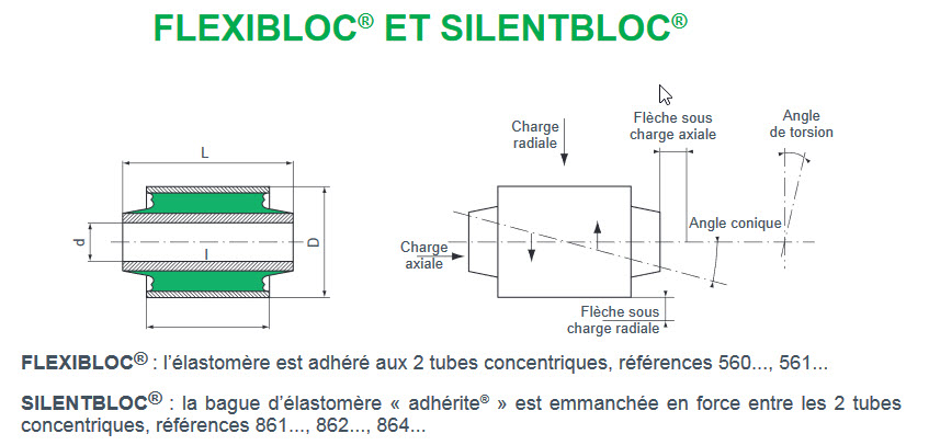 Silentbloc : Silentbloc est une appellation déposée par Pulstra (Ancinne marque française, aujourd'hui filiale du groupe Hutchinson) pour son produit composé de deux tubes avec un élastomère emmanché de force entre les deux. Cela permet un mouvement relatif entre les deux tubes. Ils sont principalement utilisés, sur un Defender par exemple, comme articulation élestique dans la suspension (voir dessins). Par extension et abus de language, les support amortisseurs de vibration (produit fabriqué par Pulstra aussi), sont appelés à tord silent bloc. Par exemple : "silentbloc de moteur"