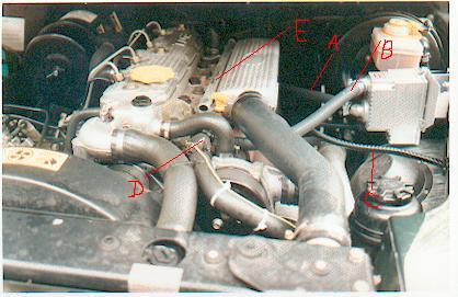 La durite D allait auparavant se connecter sur le tuyaux E (fixé au moteur) et permettait à l'eau d'aller au chauffage du Def.