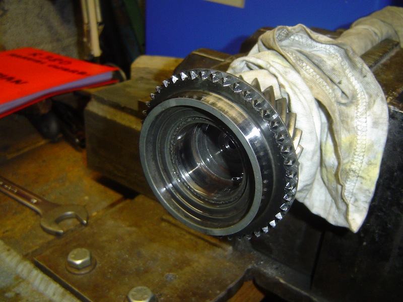 Côté boite, on découvre les pignons de 5° et de MA, la fourchette de commande et les synchros, et les bagues intérieures des roulements à rouleau.