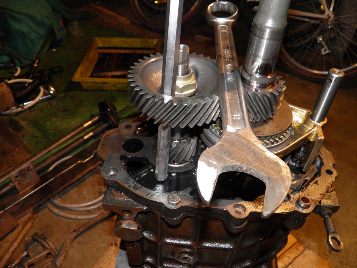 On commence par le roulement arrière de l'arbre de sortie. En prenant appui derrière le pignon de 1°, et en faisant pression sur l'arbre de sortie, on chasse le roulement. Notez que l'outillage utilisé n'est pas celui qui est prévu par le manuel.