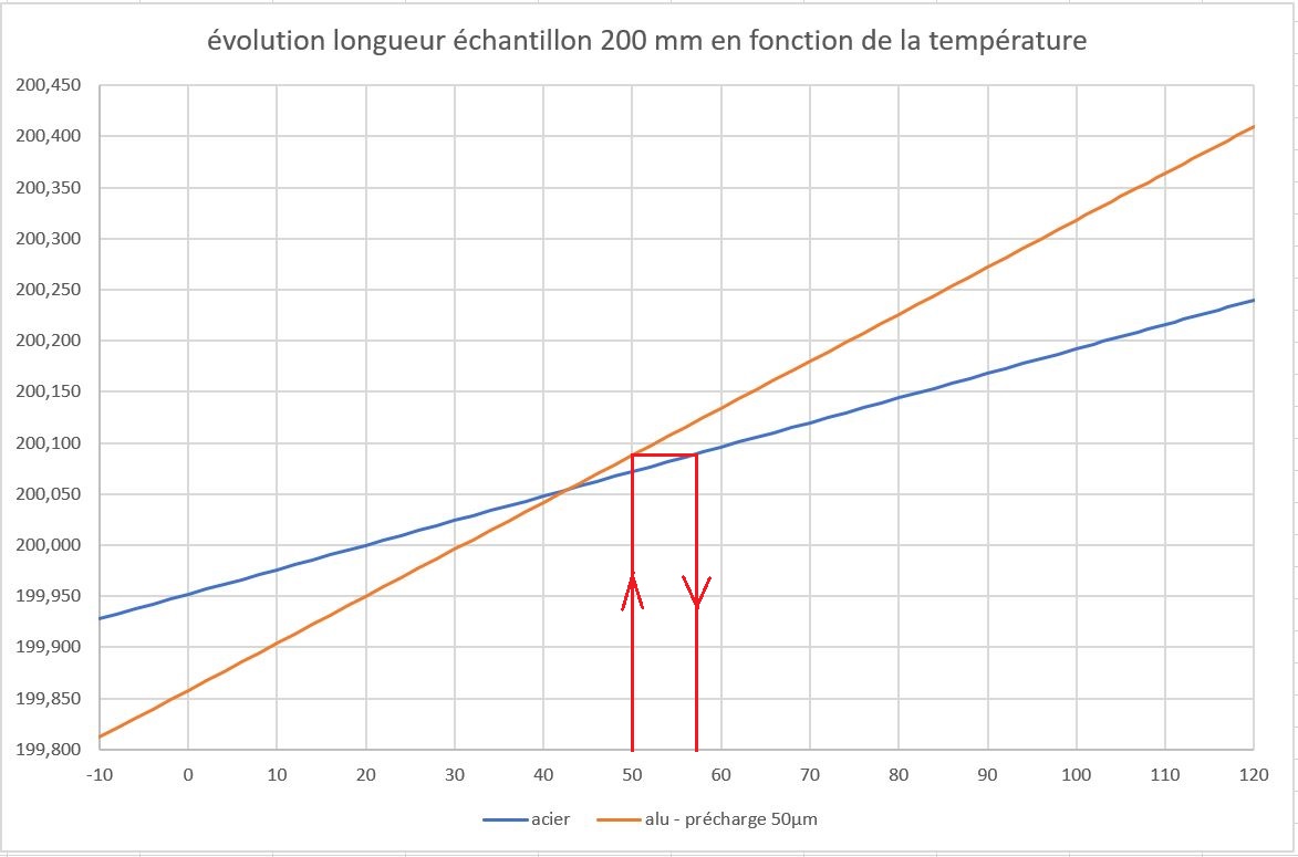 On refait la même manip avec le barreau en alu. Bien que les longueurs à 20° C soient identiques, l’alu va se dilater trois plus que l’acier. Mais l’effort exercé par l’alu sur le bâti sera pourtant le même que celui de l’acier puisque les modules de rigidité et de dilatation varient en sens inverse.