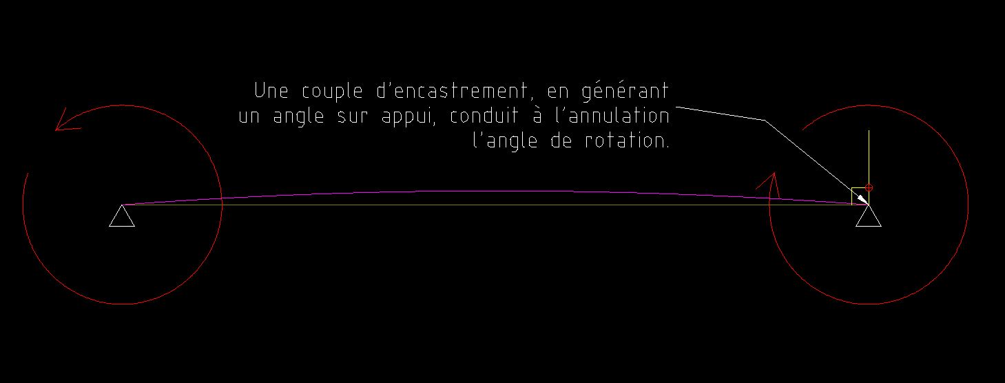 Le schéma correspondant est celui-ci. Noter que deux couples purs de même signe (ici, la fibre supérieure de la poutre est tendue) ne génèrent aucune force verticale ou horizontale, ni en travée, ni sur appui :