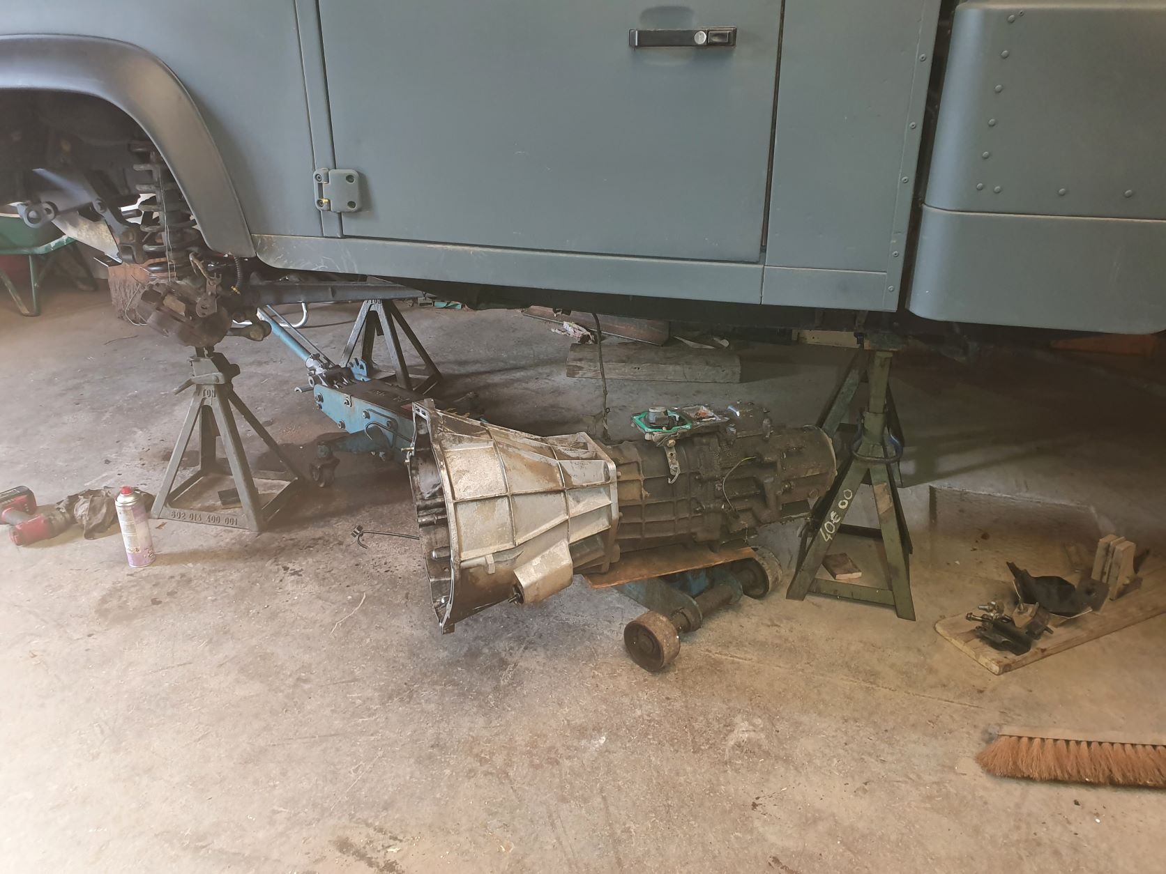Pour la descente de la BT, j'ai tout fait seul et n'ayant pas de chèvre (super recette de kébir de tu as une chèvre !), j'avais viré le siège central pour passer un petit palan à chaine supporté par une poutre posée sur 2 tréteaux de maçon (après retrait des portières évidemment !). Ainsi, j'ai pu travailler seul et en sécurité.