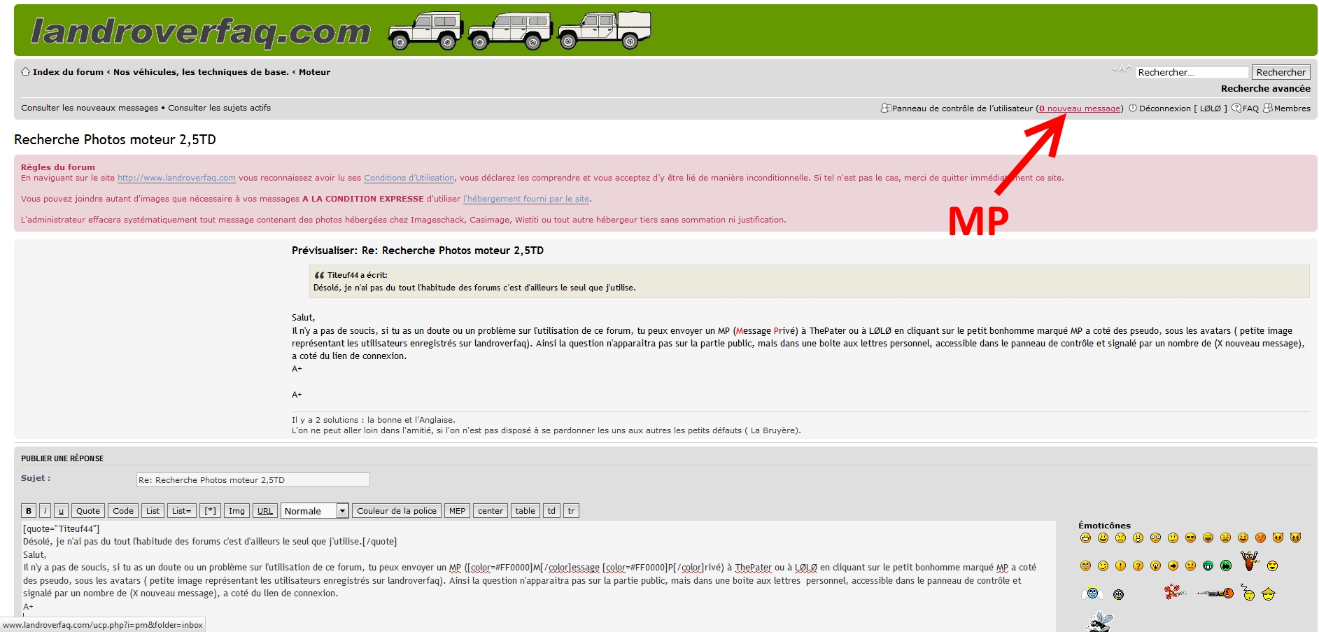 Il n'y a pas de soucis, si tu as un doute ou un problème sur l'utilisation de ce forum, tu peux envoyer un MP (Message Privé) à ThePater ou à LØLØ en cliquant sur le petit bonhomme marqué MP a coté des pseudo, sous les avatars ( petite image représentant les utilisateurs enregistrés sur landroverfaq). Ainsi la question n'apparaitra pas sur la partie public, mais dans une boite aux lettres personnel, accessible dans le panneau de contrôle et signalé par un nombre de (X nouveau message), a coté du lien de connexion. A+