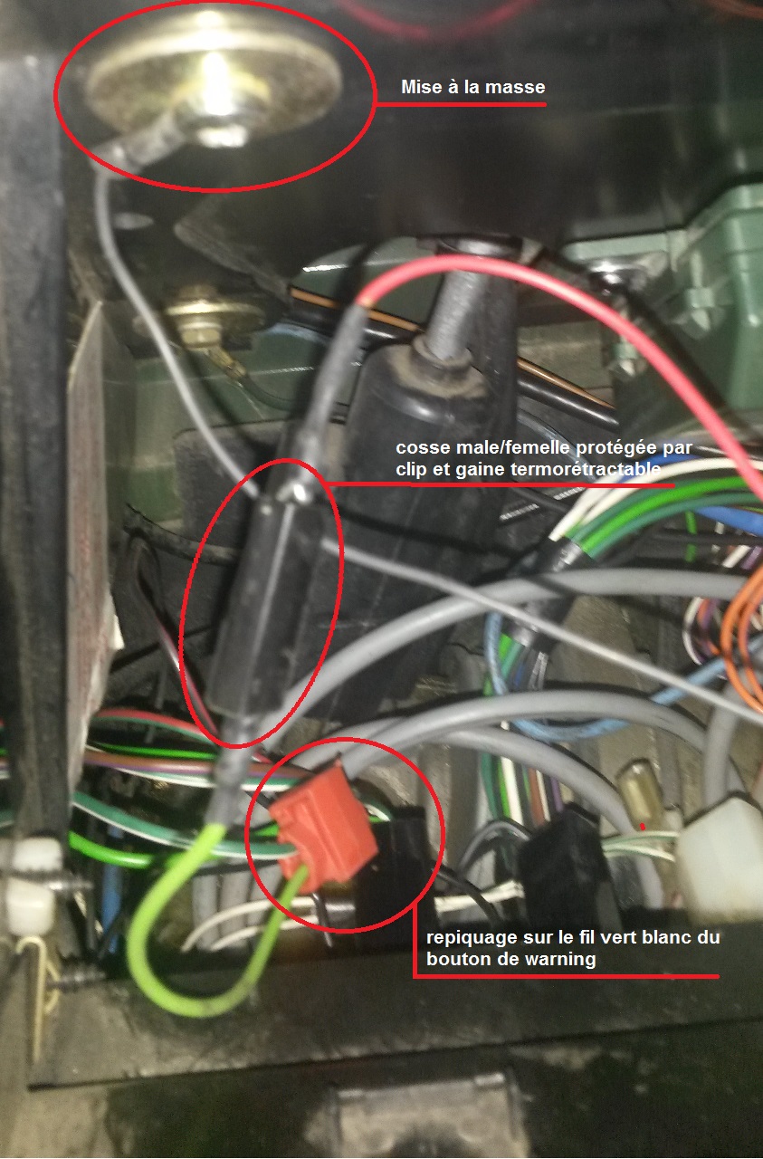 . Il faut te piquer sur le fil vert clair liseré marron avant la répartition gauche/droite par le commodo. Fais attention de ne pas le confondre avec le vert liseré rouge du clignotant gauche, parfois avec le temps; ou à la fabrication; ou la lumière; il est difficile de différencier le liseré rouge, du marron, sur le fil vert.