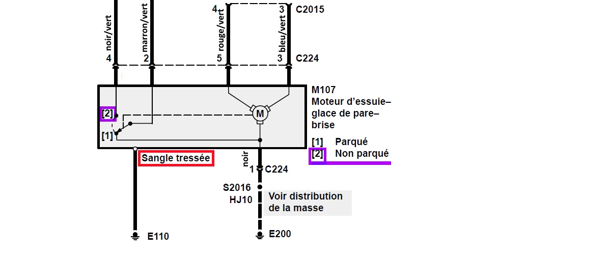 Tu peux faire des mesures à l'ohmmètre des deux positions, "parqué" et "non parqué" directement sur le connecteur. Repère toi avec les couleurs équivalentes coté faisceau châssis, car coté faisceau moteur elles ne correspondent pas au schéma, car elles sont spécifiques au fabriquant du moteur d'essuie glace.