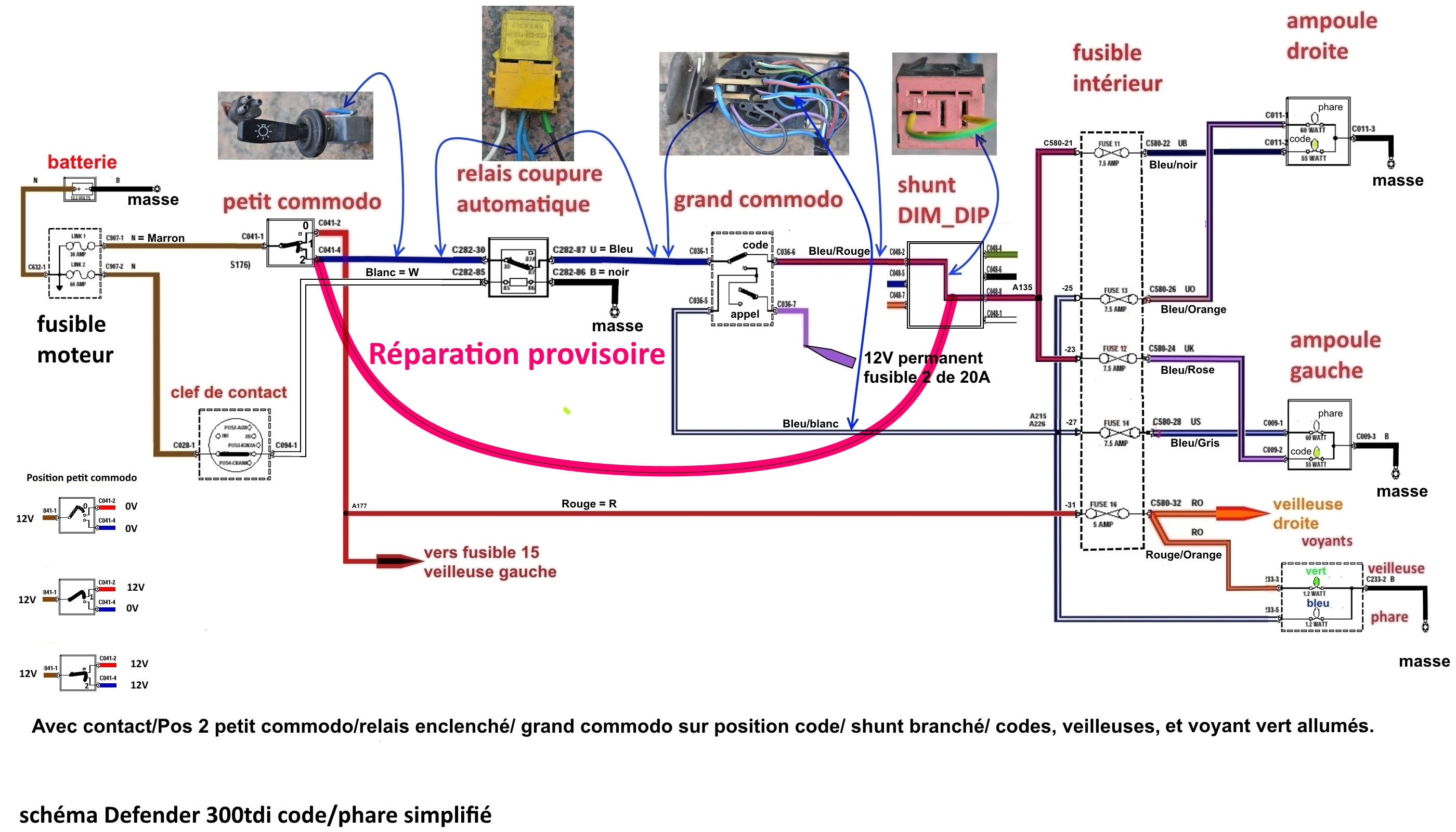 L'arrivé du fil bleu, lui aussi peut déconner, car ce qui est bizarre, c'est que cela fonction en phare moteur tournant et pas moteur arrêté, avec le contact.