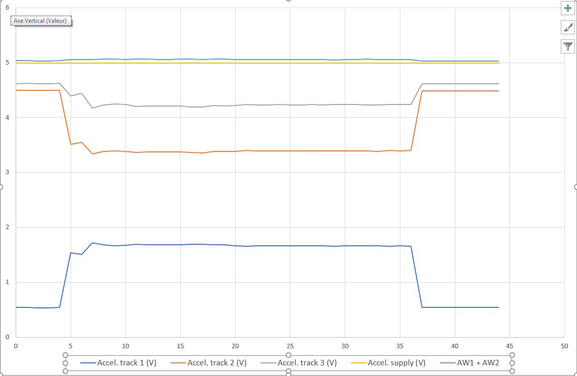 Remarques : La somme des tensions des capteurs 1 et 2 doit toujours être égale à 5 volt, pour le 3 pistes, si ce n'est pas le cas, c'est qu'il y a un défaut. Au nano, il faut lire: (driver demande 1) en volt + (driver demande 2) en volt = driver demande supply.