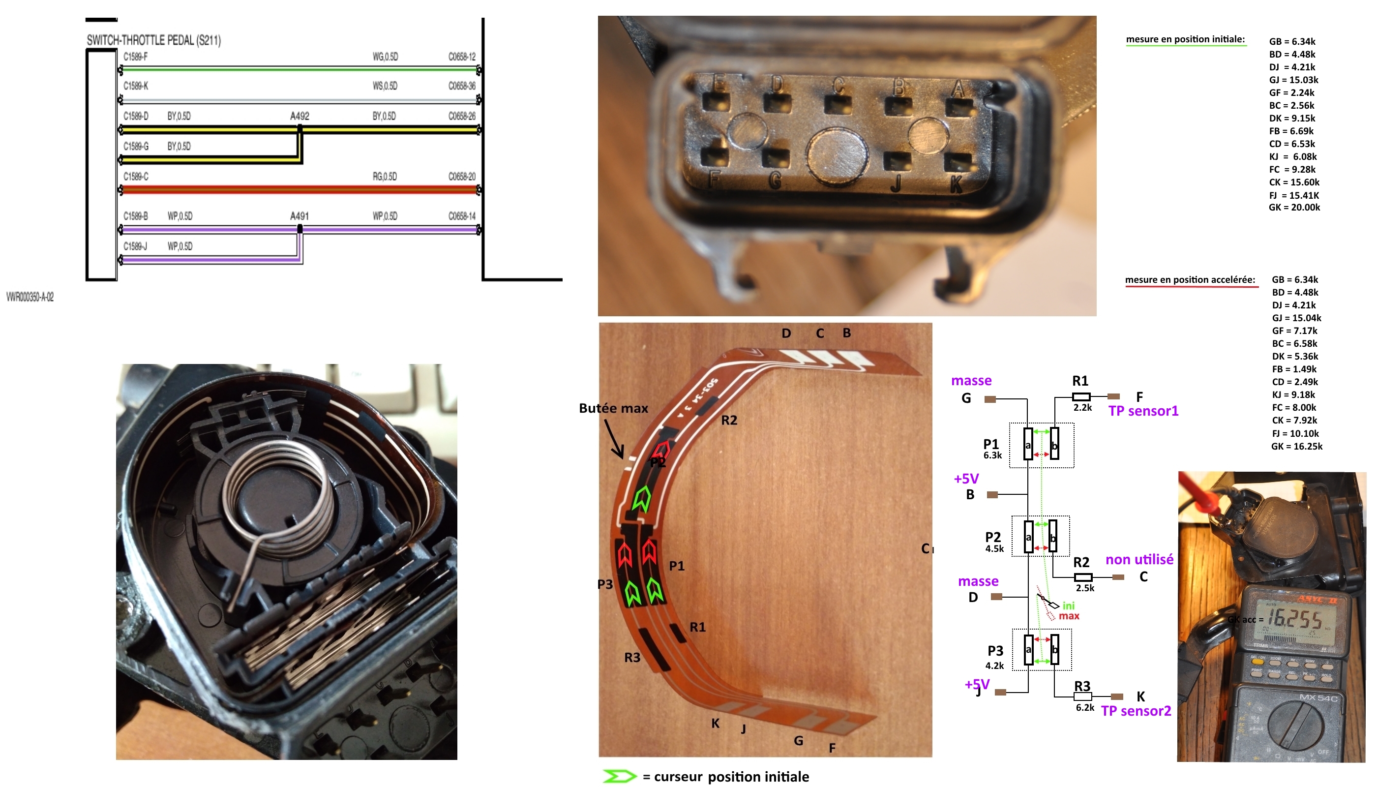 Ces mesures peuvent donner une indication de l'état du capteur, qui n'est pas forcement coupable d'un problème, et à plus de 100€ le bout on y réfléchi à deux fois, car il y a le faisceau et les connecteurs entre le calculateur et le capteur de position de la pédale.