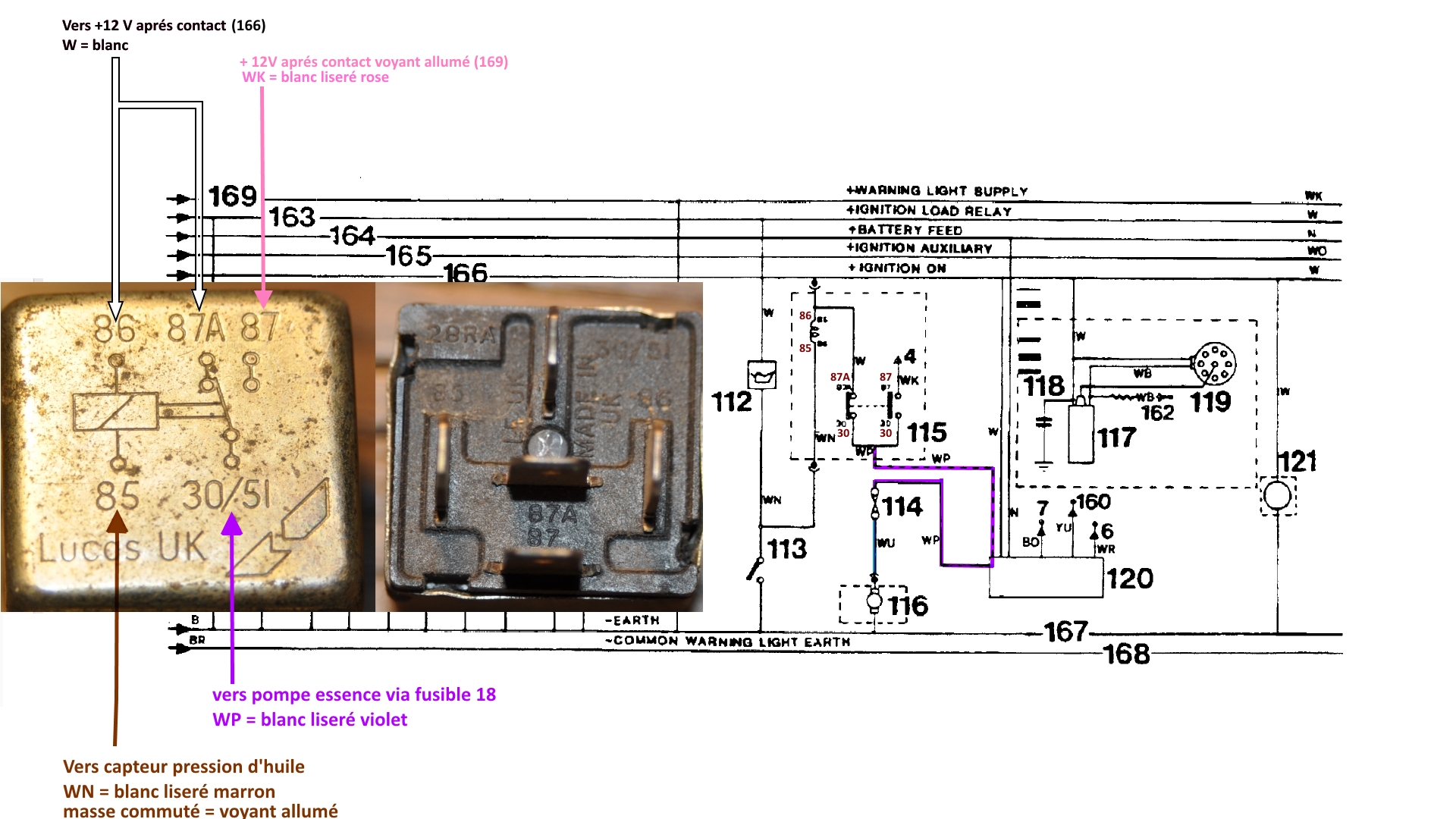 Le schéma avec le relais, afin que tu fasses bien la correspondance entre le schéma et les broches du relais ainsi que les couleurs correspondantes aux fonctions, car je te l'accorde, les vieux schémas du range, ne sont pas des exemples de limpidités. Je ne comprends toujours pas la justification de ce montage avec l'alimentation par l'alimentation des voyants tant que le voyant d'huile est allumé, puis une alimentation le + après contact une fois la pression d'huile est atteinte et que le voyant s’éteint. Cela pourrait faire le sujet d'un quiz, mais n'ayant pas la réponse, je m'en garderai bien.