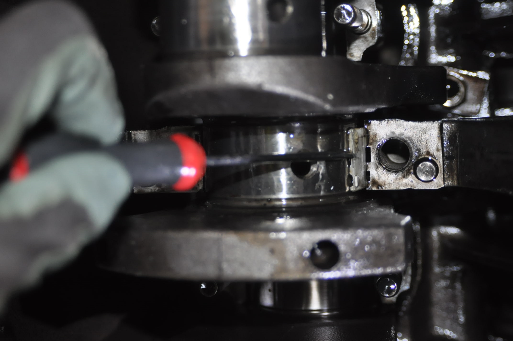 55) Coussinet supérieur du cinquième palier en place lui aussi. C'est souvent une question qui revient sur le tapis, est-il possible de mettre en place les paliers de vilebrequin in situe ?
