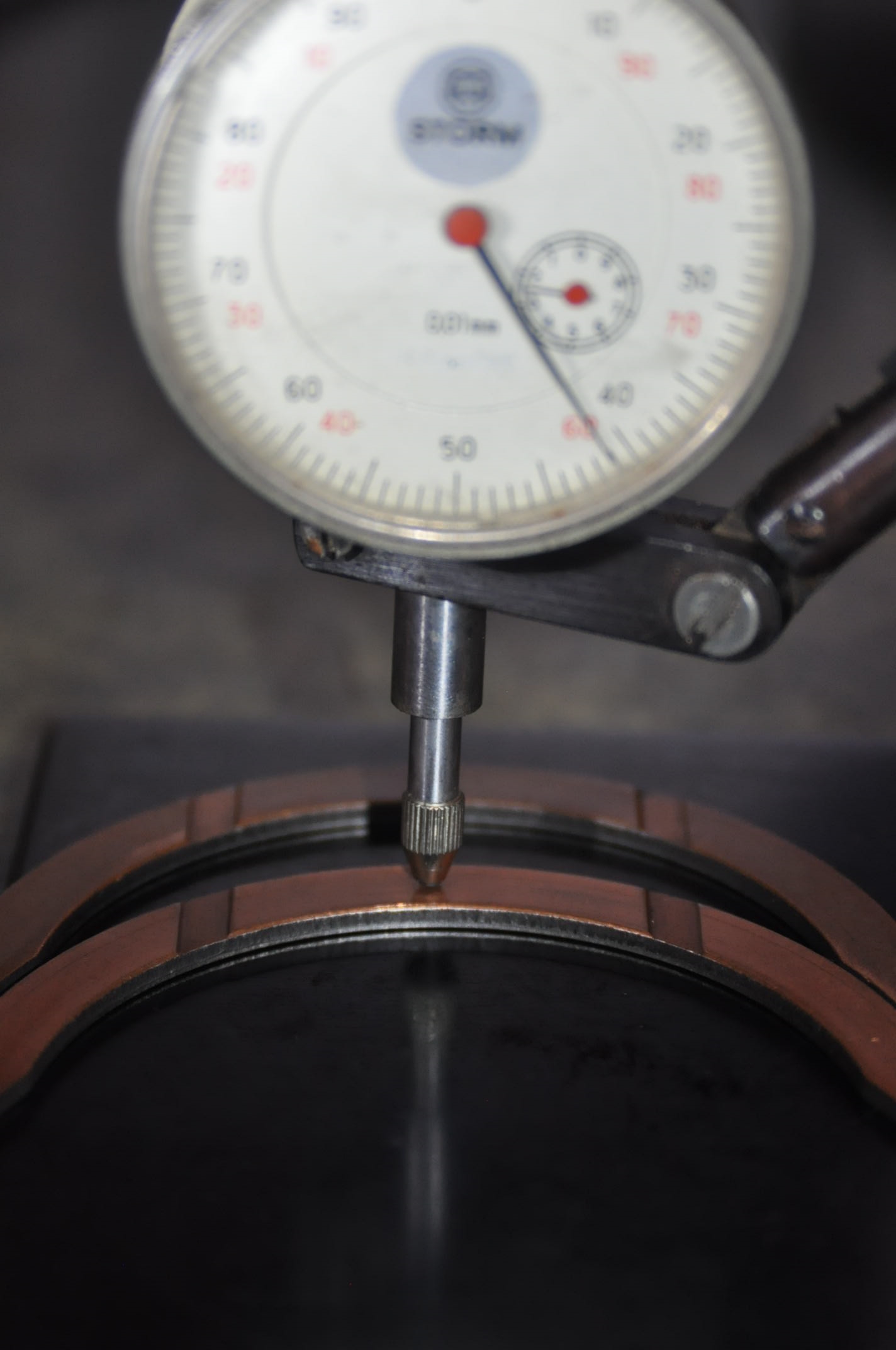 34) Des petites mesures comparatives "olé olé" sur un coussinets de bielle en taille standard, neuf et usagé; afin d'évaluer l'usure. Le zéro est réglé sur le marbre.
