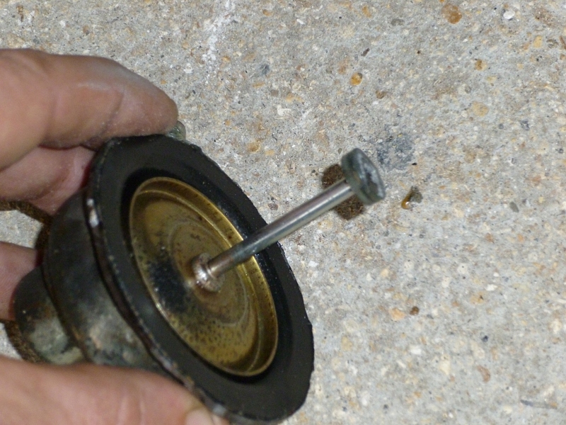 Même si j'entendais un petit bout de métal se balader dans la pompe, ma crainte était que ce morceau de métal qui se coince dans le doigt soit parti "se balader" du côté de l'arbre à cames. J'ai donc ouvert la pompe à la disqueuse. J'ai ainsi pu extraire ce morceau qui est normalement fixé au bout de la tige. Fort heureusement, sa conception en forme de disque l'empêche de passer par l'espace sous le doigt et de sortir de la pompe.