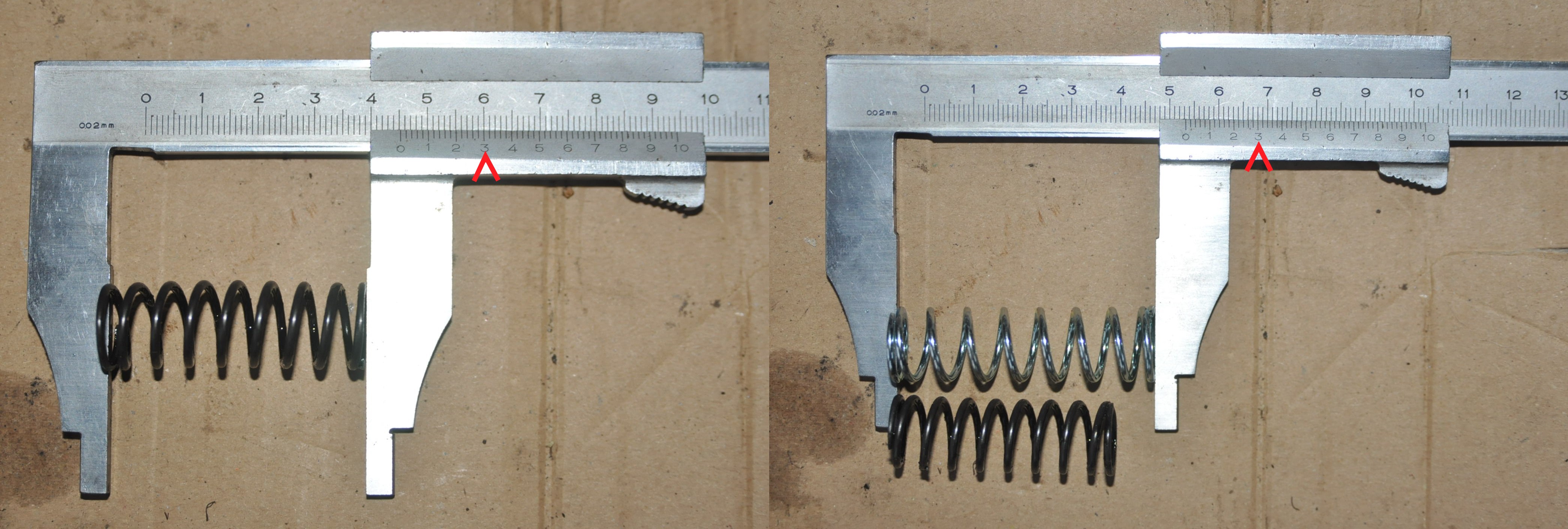 19) Mesures comparatives du ressort du clapet: le vieux mesure à 45.3 mm et le neuf 53,3 mm. Bon je vois mal comment mesurer les 31 mm ou plutôt, comment comprimer ce ressort avec une charge de 7,71 kg, désolé, je ne suis pas équipé