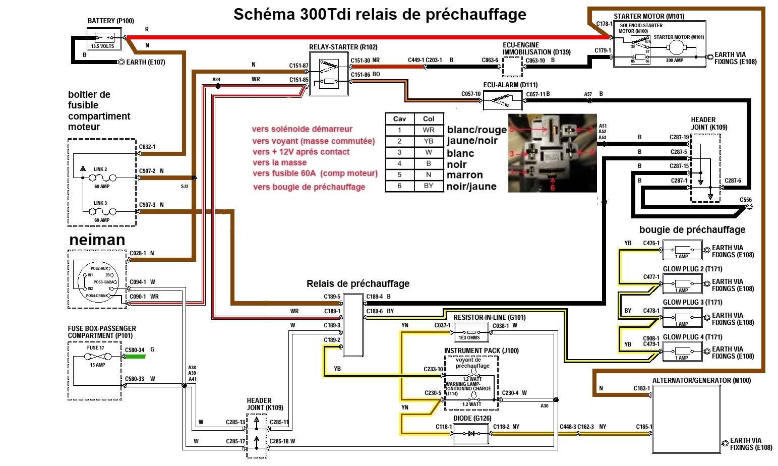 C'est le support du relais de préchauffage PRC6913, comme tu peux le remarquer c'est un produit estampillé Ford, avec une référence dessus... Avec le faisceau complet seulement : PRC6083 à 60 € chez LRséries. Un schéma, valable pour le 200 et le 300 : Maintenant, si j'ai un conseille a te donner, ne t'embête pas avec ce système, conserve le principe du préchauffage au neiman des D; TD ou même des séries.