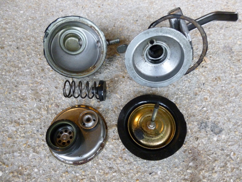 Même si j'entendais un petit bout de métal se balader dans la pompe, ma crainte était que ce morceau de métal qui se coince dans le doigt soit parti "se balader" du côté de l'arbre à cames. J'ai donc ouvert la pompe à la disqueuse. J'ai ainsi pu extraire ce morceau qui est normalement fixé au bout de la tige. Fort heureusement, sa conception en forme de disque l'empêche de passer par l'espace sous le doigt et de sortir de la pompe.
