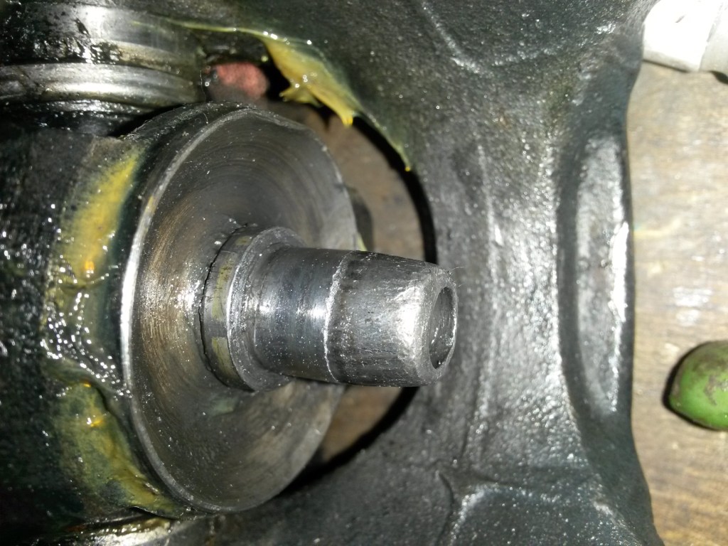 Je voulais désormais le remonter sur mon Def, mais j'étais intrigué par un point dur en position médiane. J'ai donc investigué, et j'ai trouvé la cage de centrage complètement en morceau. Le téton de centrage n'a pas du tout aimé, et il est bien usé... Pensez-vous qu'il soit possible de le sauvez en appliquant la solution de Toreo, à savoir emmancher une bague lisse sur le téton ? Dans mon cas, je pense qu'il faut l'emmancher avec du serrage car la douille ne va pas porter sur toute la longueur du téton.