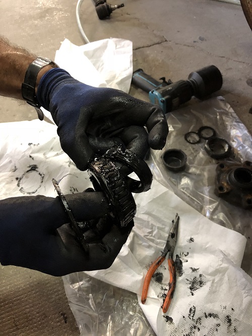 La graisse noire et "visqueuse", et non début de carbonisation/oxidation, c'est normal. La graisse fluide, ou l'huile, des bols est passée sous le joint interne de la fusée. Cela arrive à partir d'un certain kilométrage.
