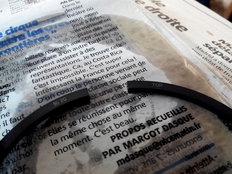 la notice de montage indique que les segments portant l'inscription TOP ont un sens donc ceux qui ont une inscription sans TOP n'ont pas de sens....mais pour faire plaisir à LØLØ on la place vers le haut du piston quand même...gna gna gna...en fait, aucun risque le profil de ce segment est symétrique et parfaitement cylindrique si l'on excepte les lumières de retour d'huile. (je l'ai bien observé à la loupe)