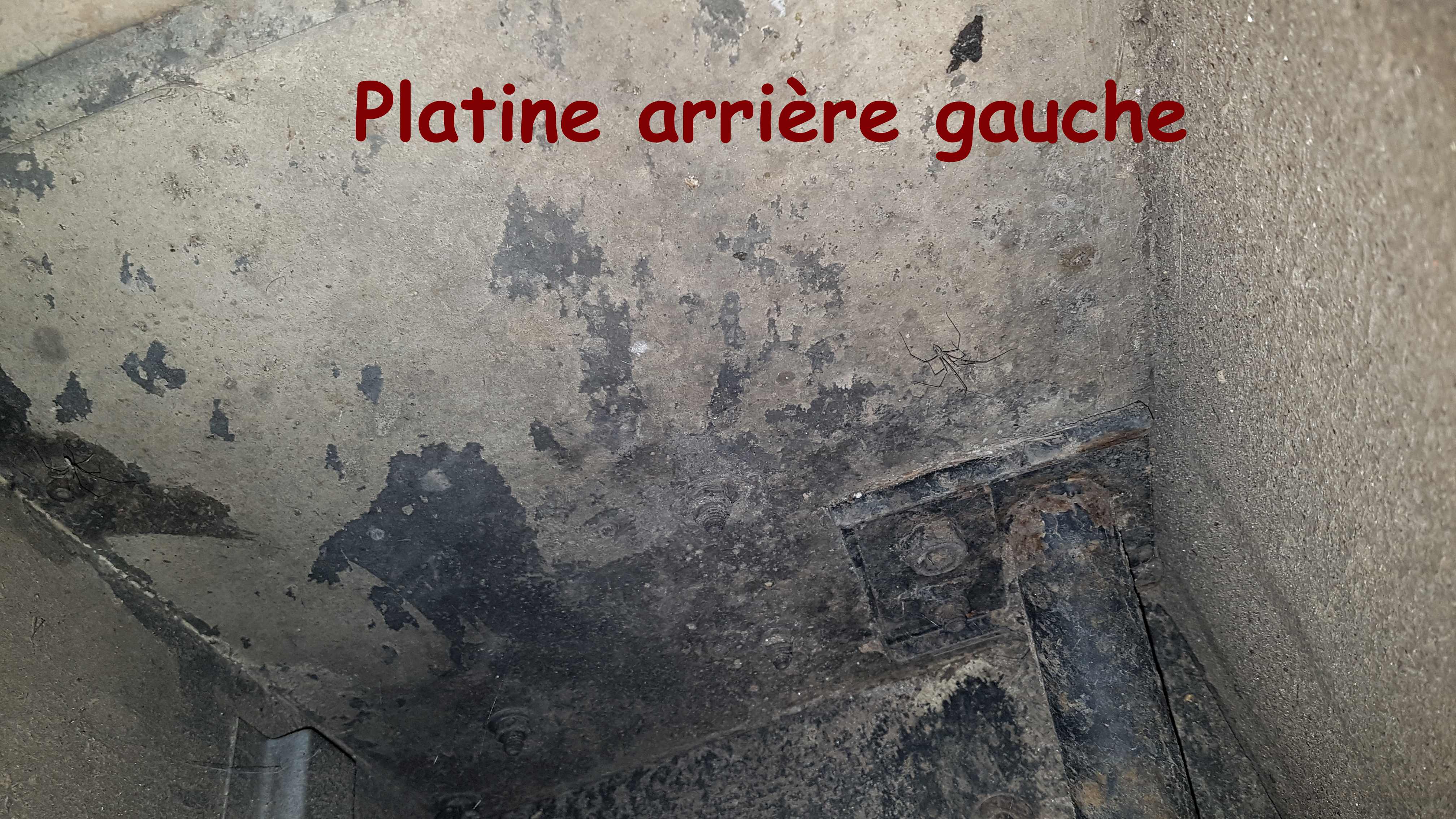 Les ceintures et les sièges sont démontés, mais les vis sont remises en places pour boucher les trous. Coté passage de roue pour la ceinture du siège le plus avant : Coté passage de roue pour la ceinture arrière la platines est identiques a celle de devant. NB: il y a un arceau LMT fixé sur le land avec reprise sur le châssis. Ce que tu peux voir sur la première photo avec les quelques bouts en plus.